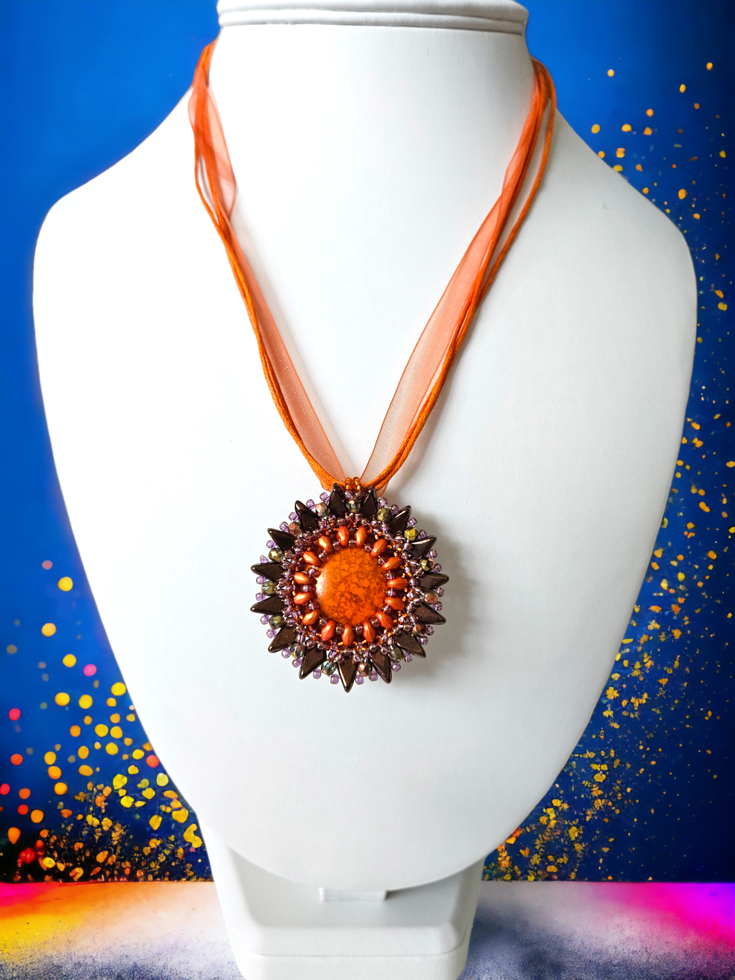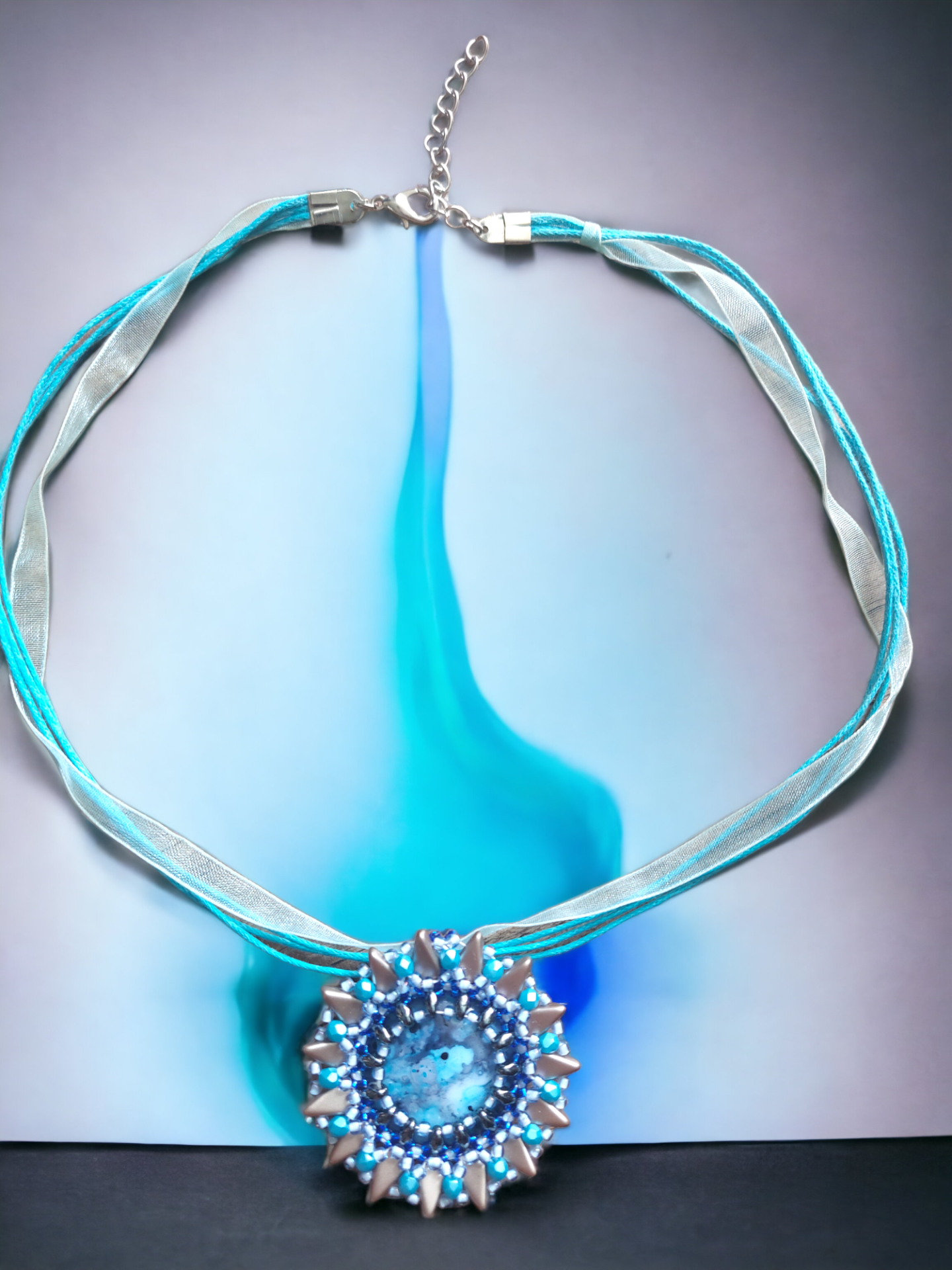 skleněný kabošon, japonský rokajl Toho, stužka se šifonem, délka cca 25 cm