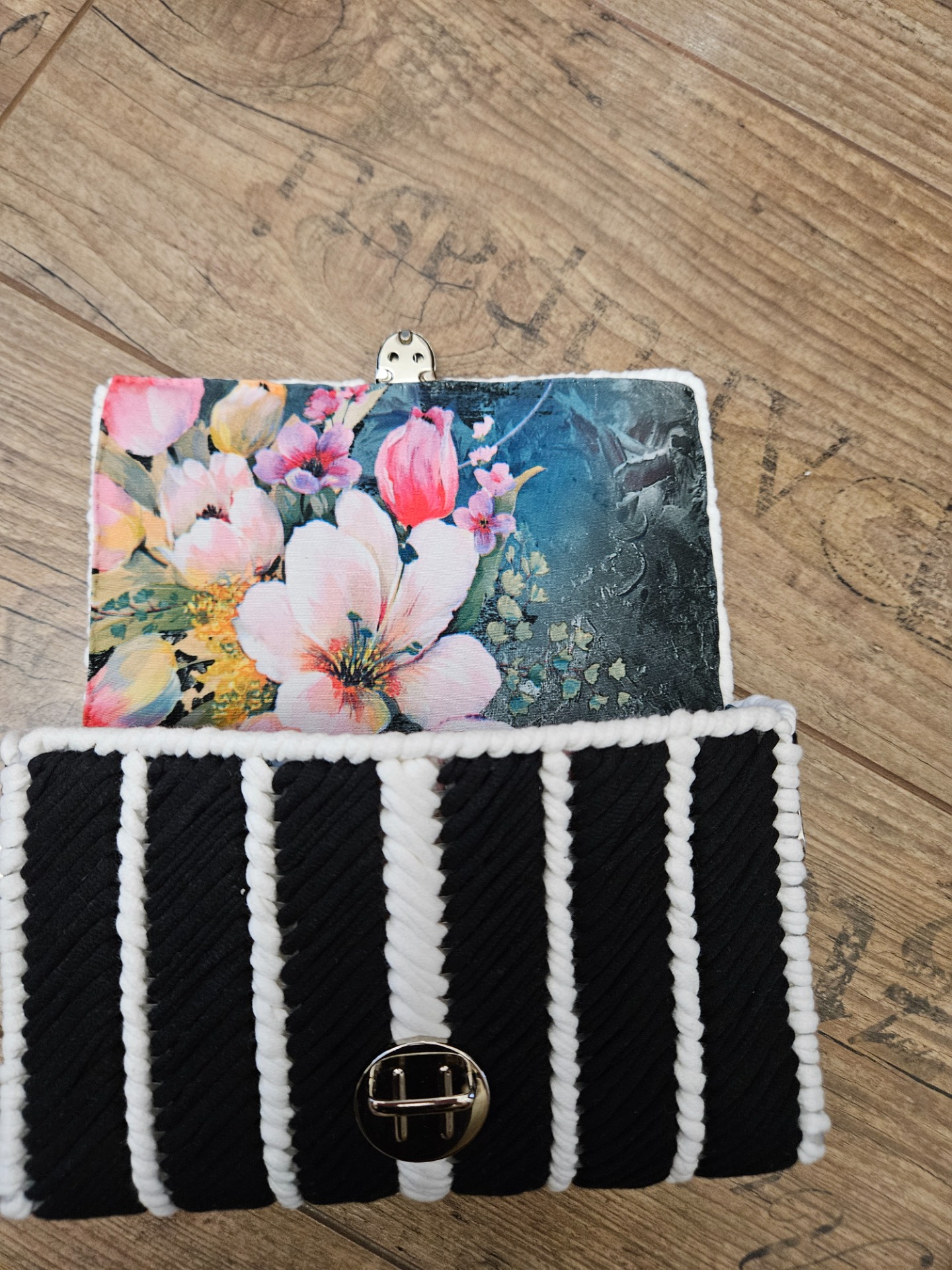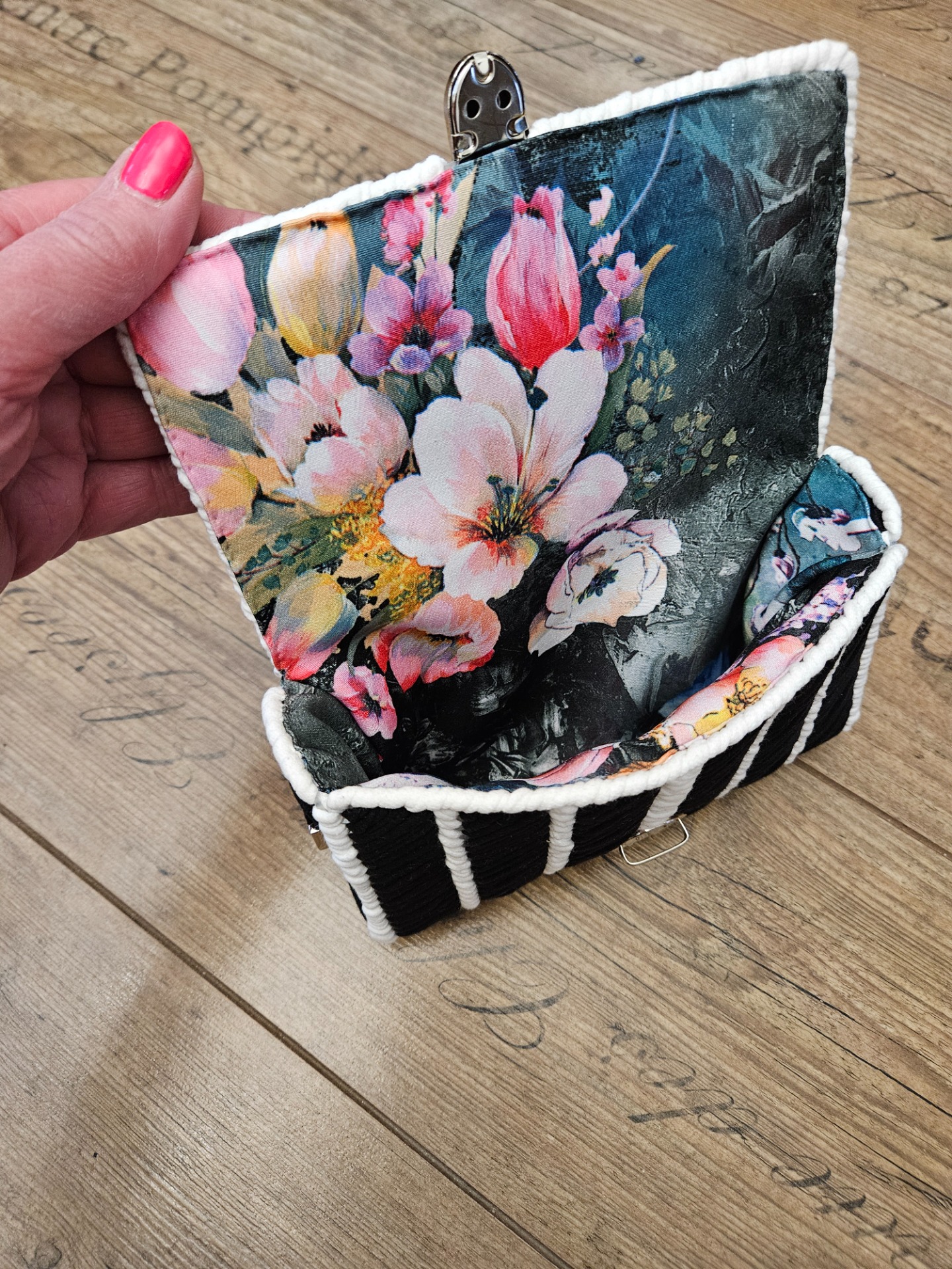 Plastová kanava, vyšívaná přízí bavlna, podšívka polyester, řetízek a zapínání bižuterní komponenty, kabelka je lehká, ale díky plastové kanavě drží hezky tvar, rozměry 20x14x6 cm