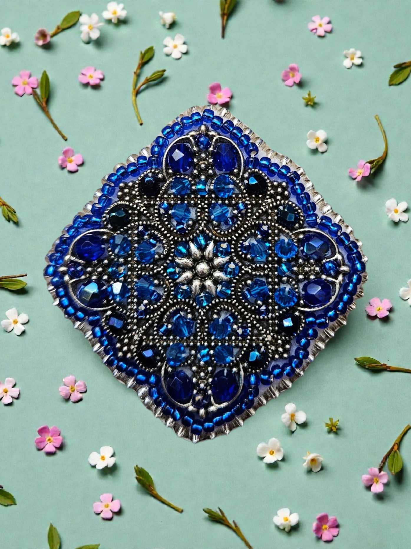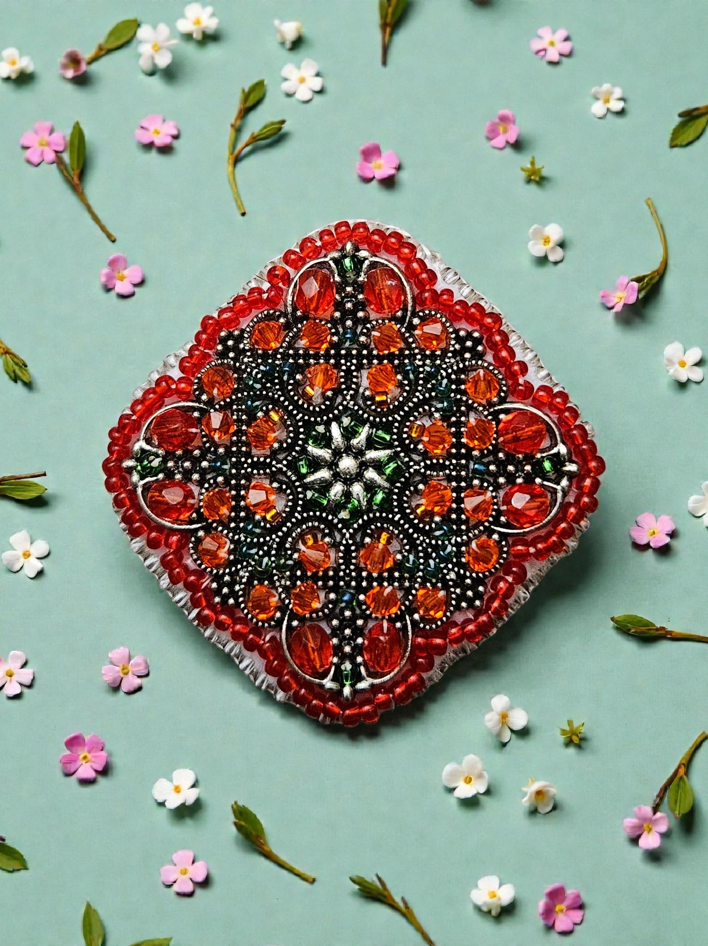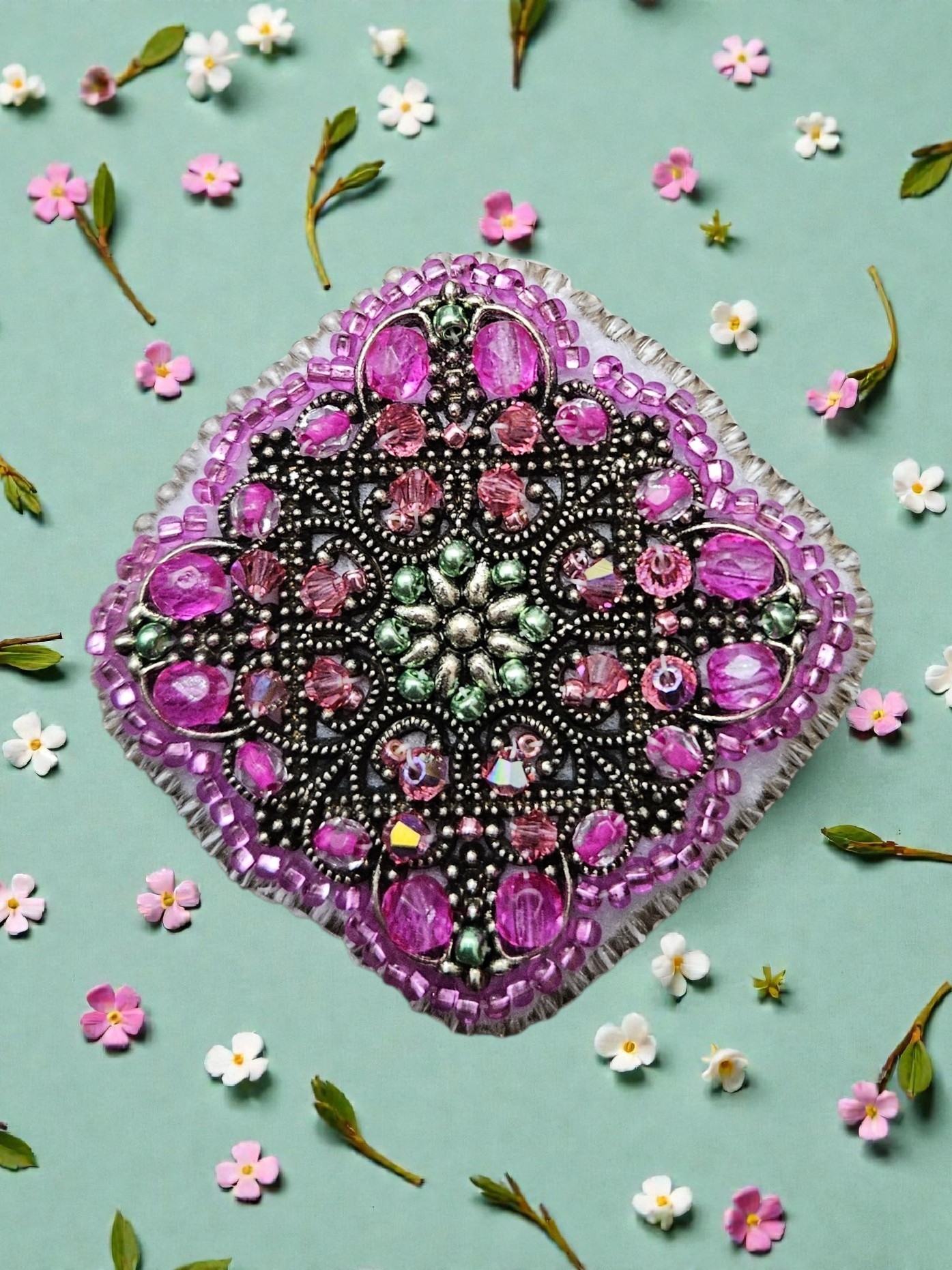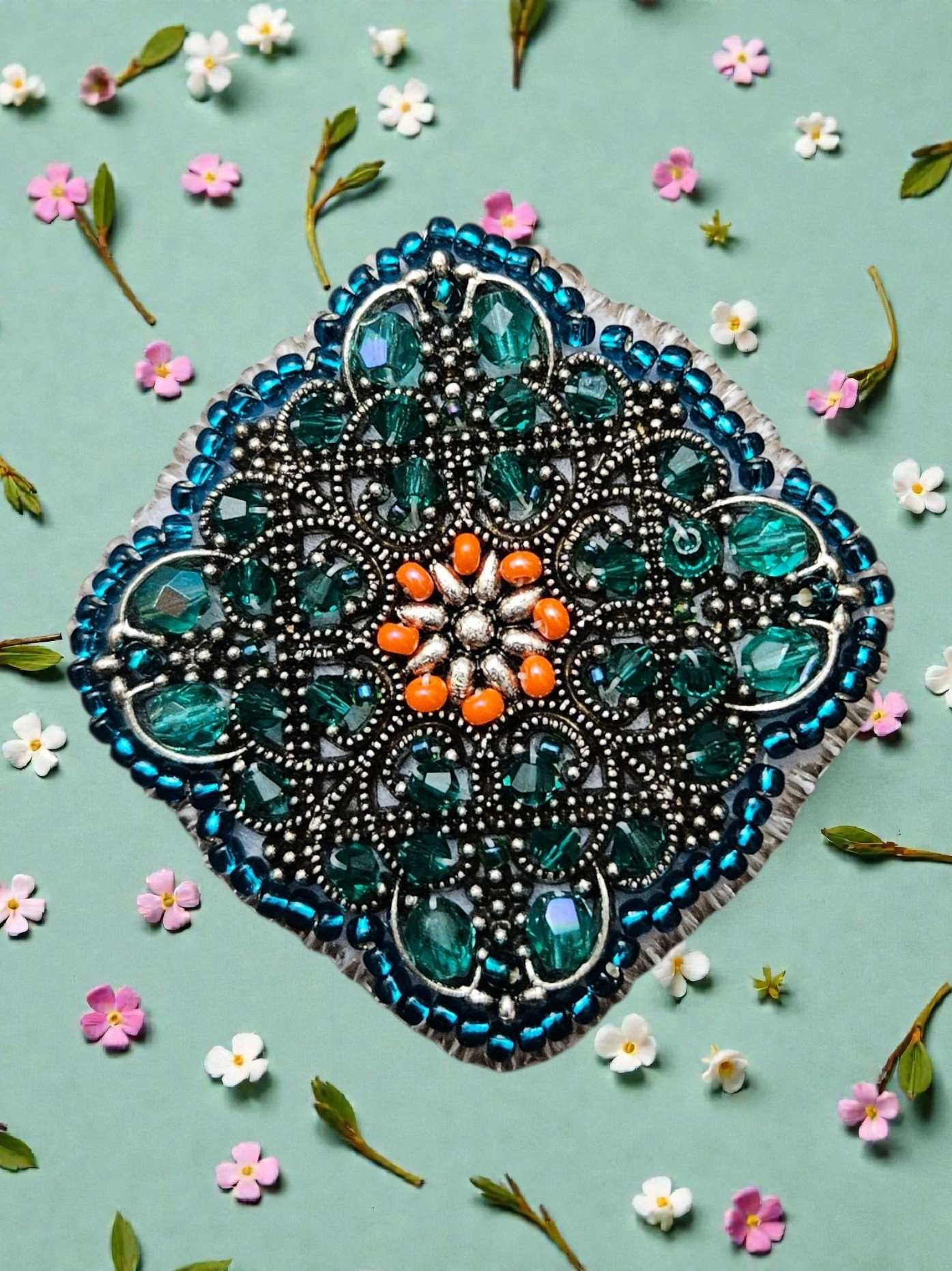 Elegantní filigránová brož zdobená broušenými skleněnými korálky, které nádherně odrážejí světlo a dodávají šperku hloubku i jiskru. Precizní kovová filigrána podtrhuje jemnost i dekorativní charakter brože.