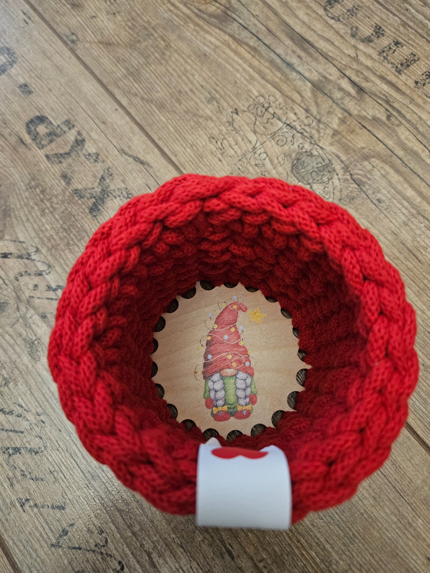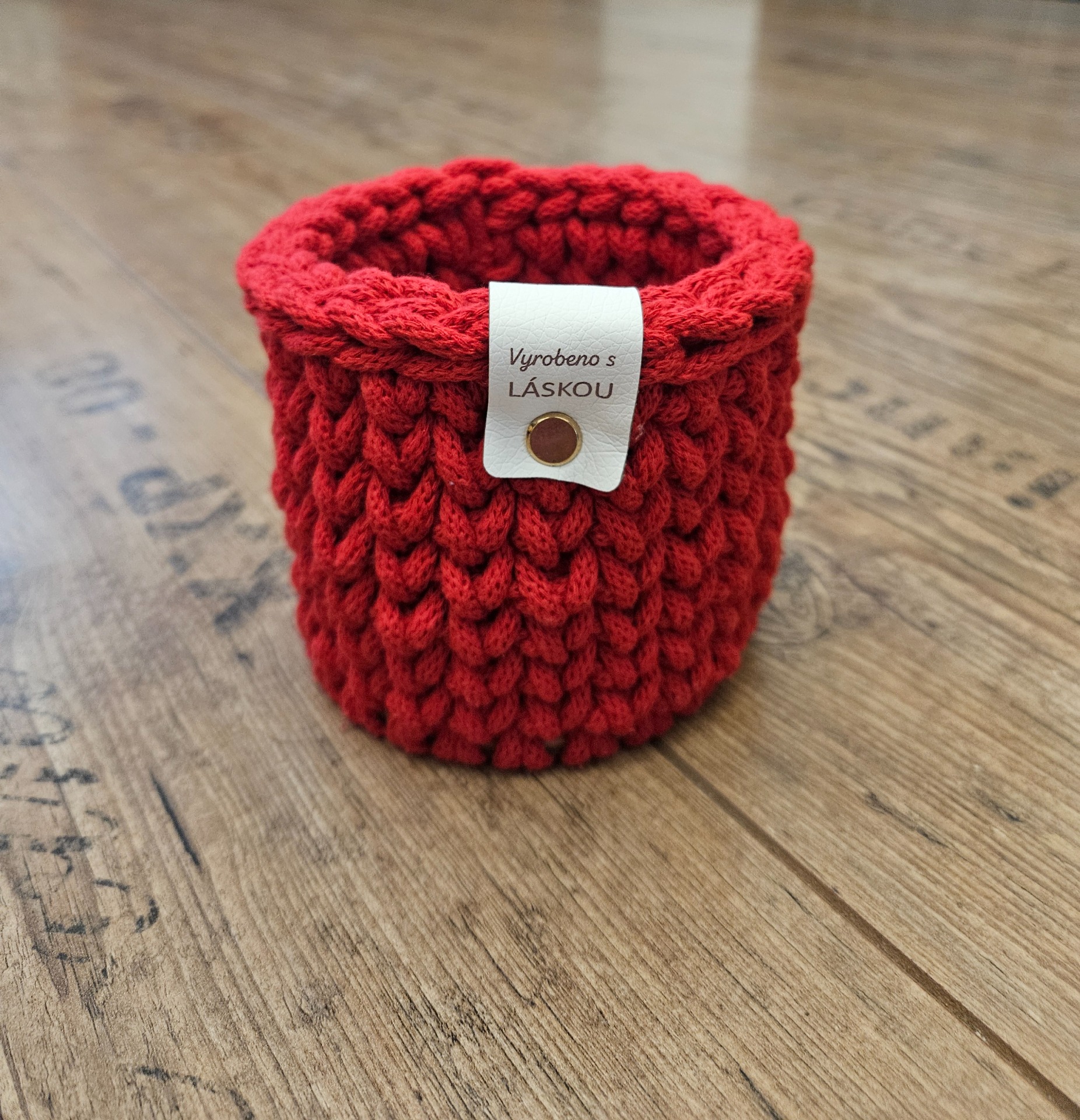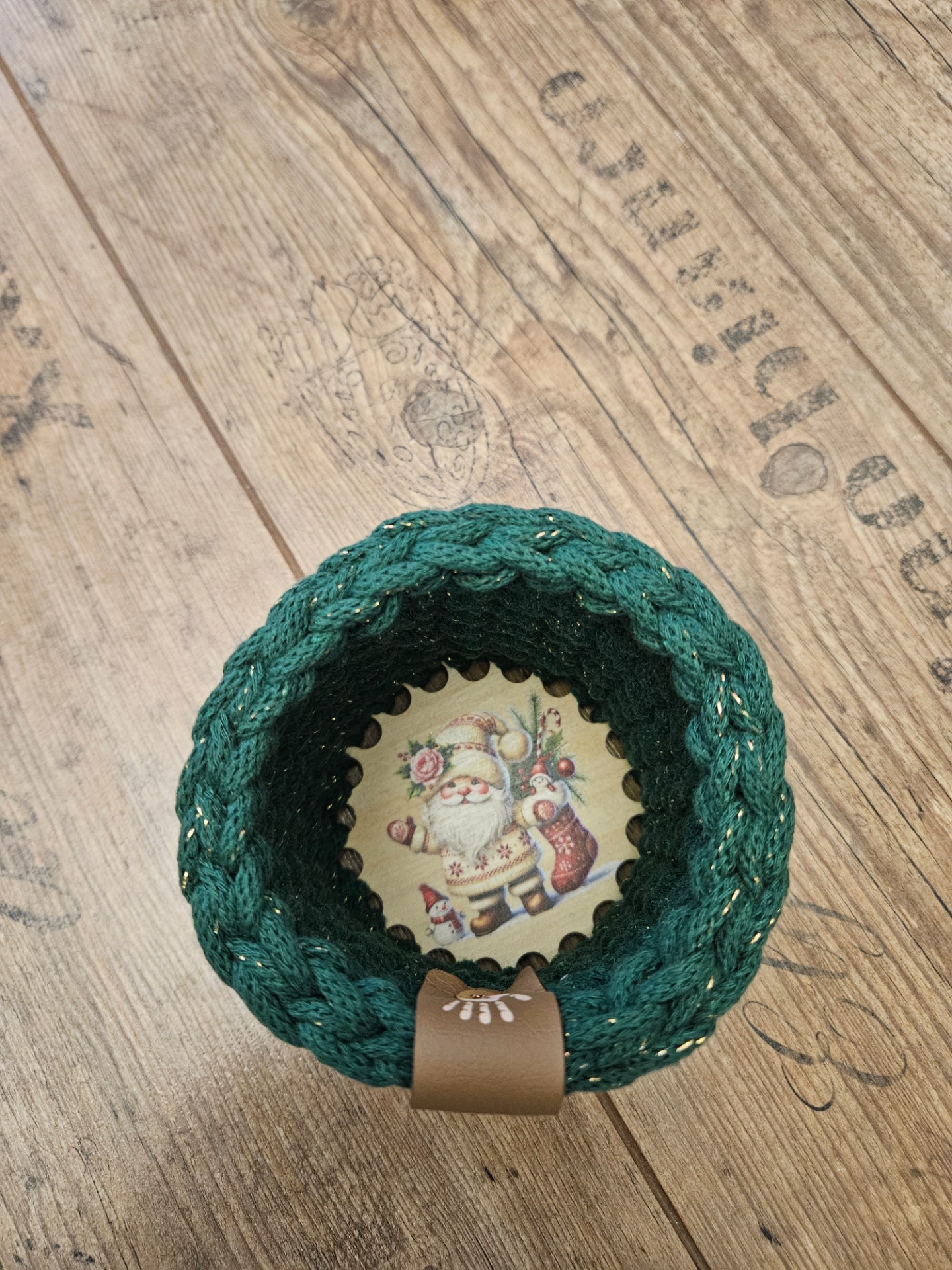 Háčkovaný košíček. menší velikost, na drobnosti , příze polyesterové jádro, bavlněný oplet, výška cca 9 cm, průměr cca 10 cm, barva zelená se zlatou nitkou a červená