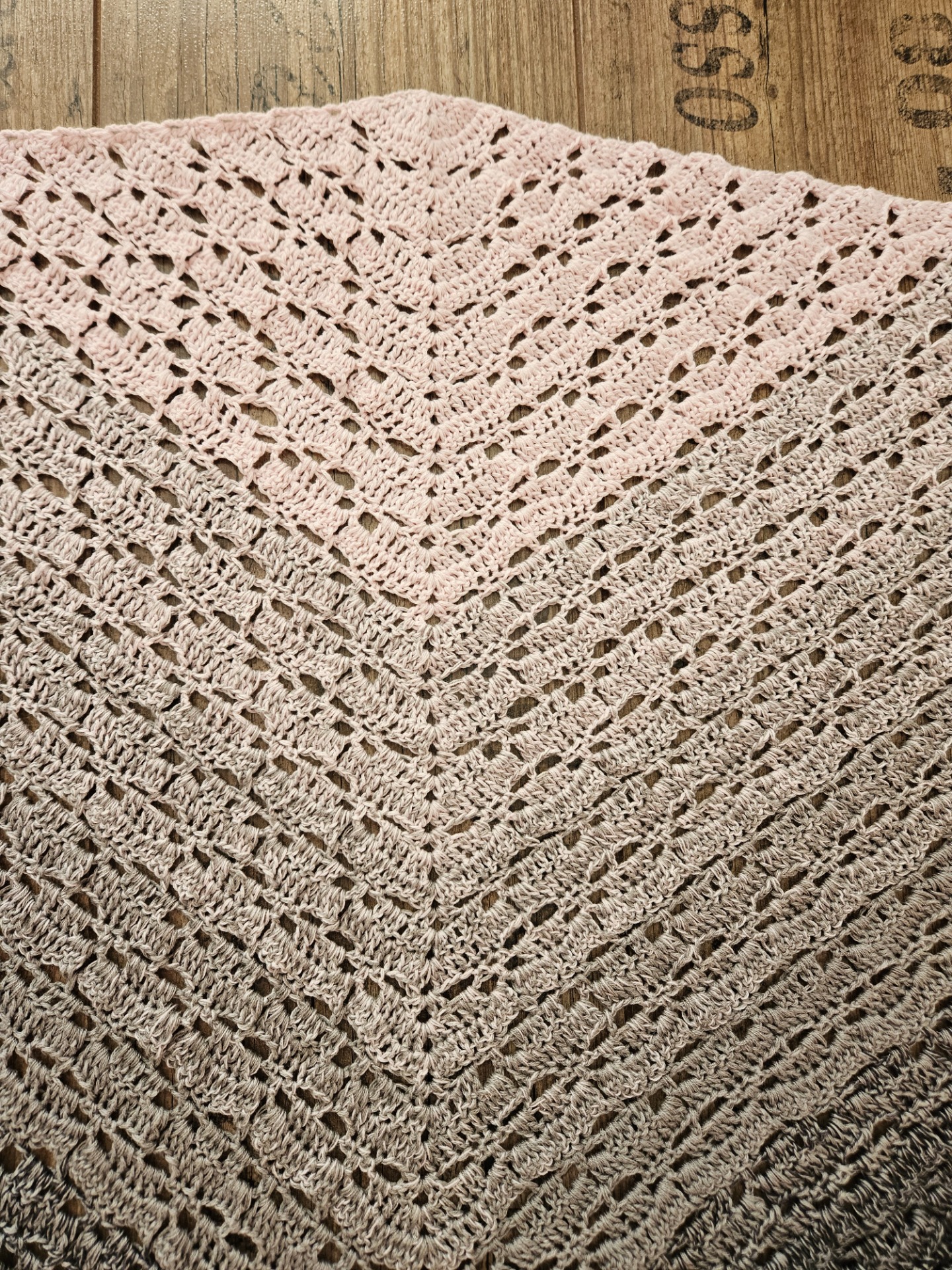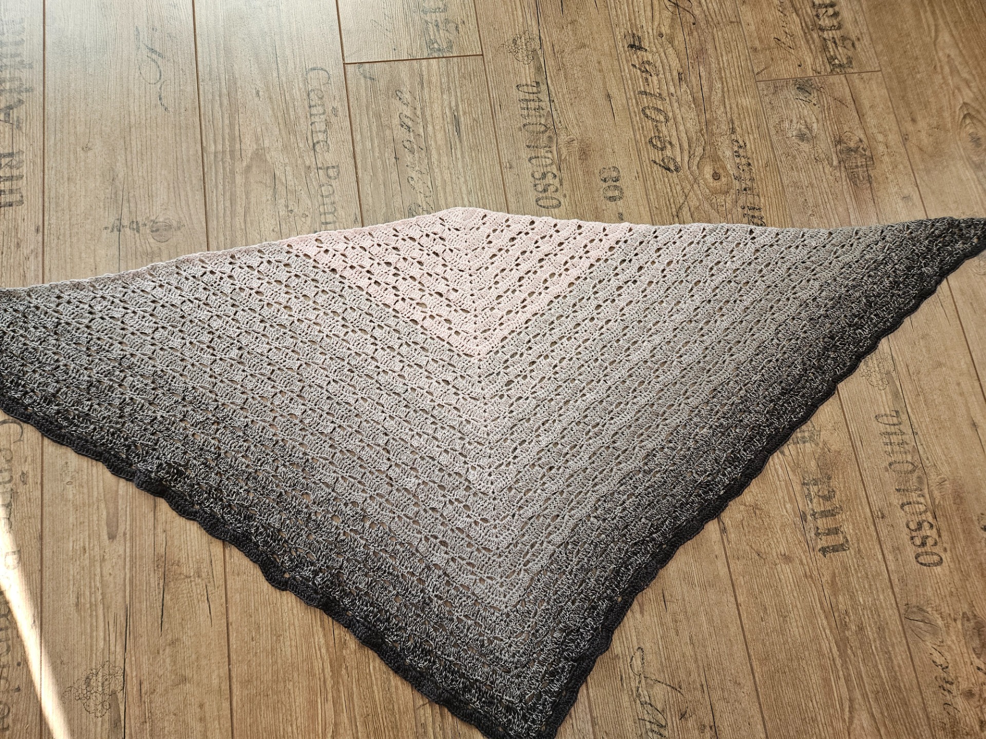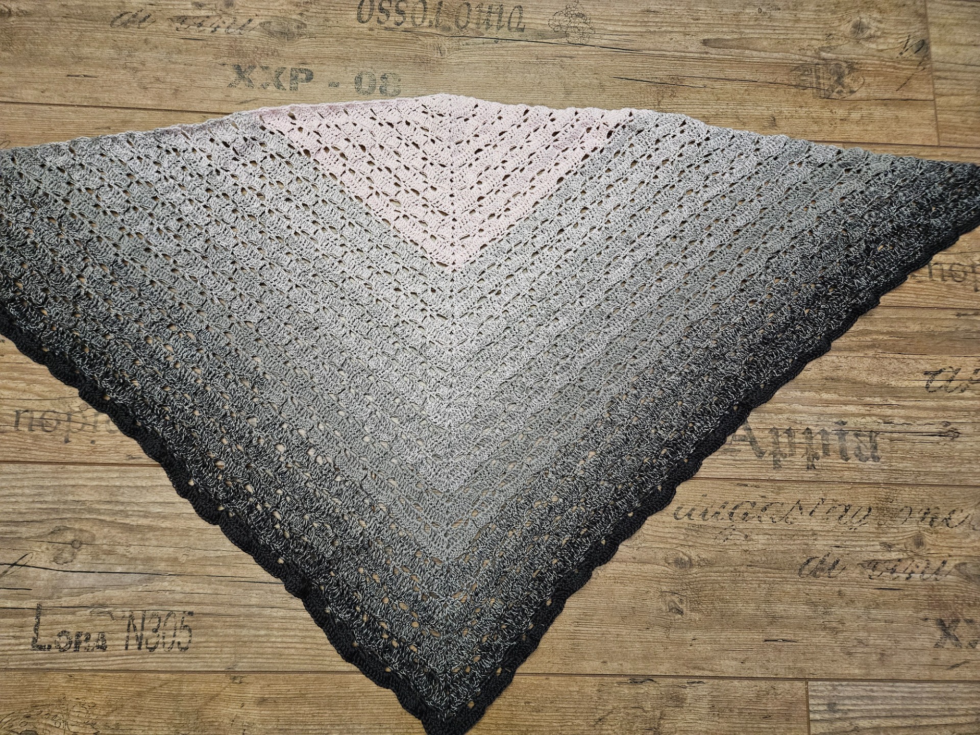 Krásný šátek v kombinaci barev od světle růžové po tmavě šedou, šátek je menší,délka 146cm, výška 66 cm, materiál 50%bavlna, 50 % akryl