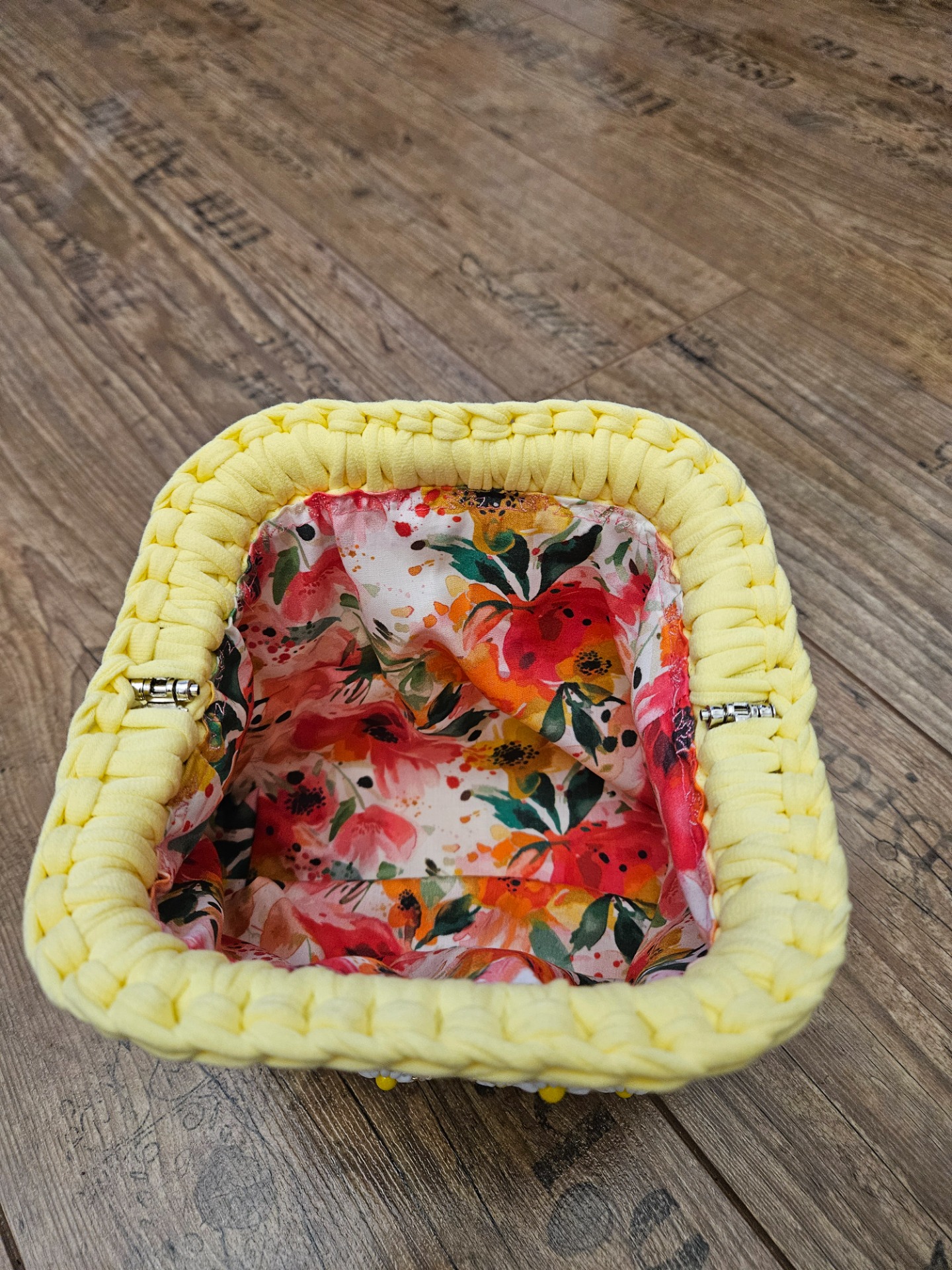 kabelka se sedmikráskami, háčkovaná, příze 100% recyklovaná bavlna, vnitřek kabelky polyester, hliníkový rám