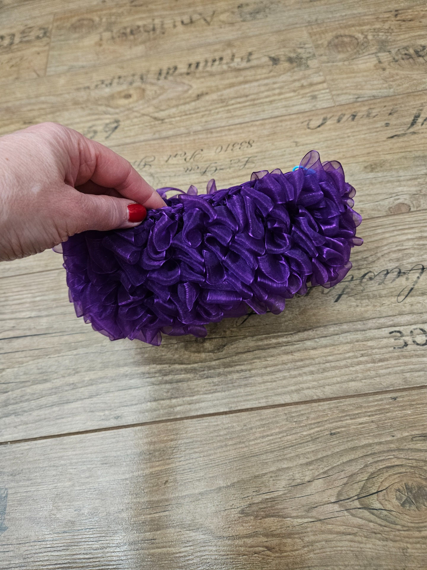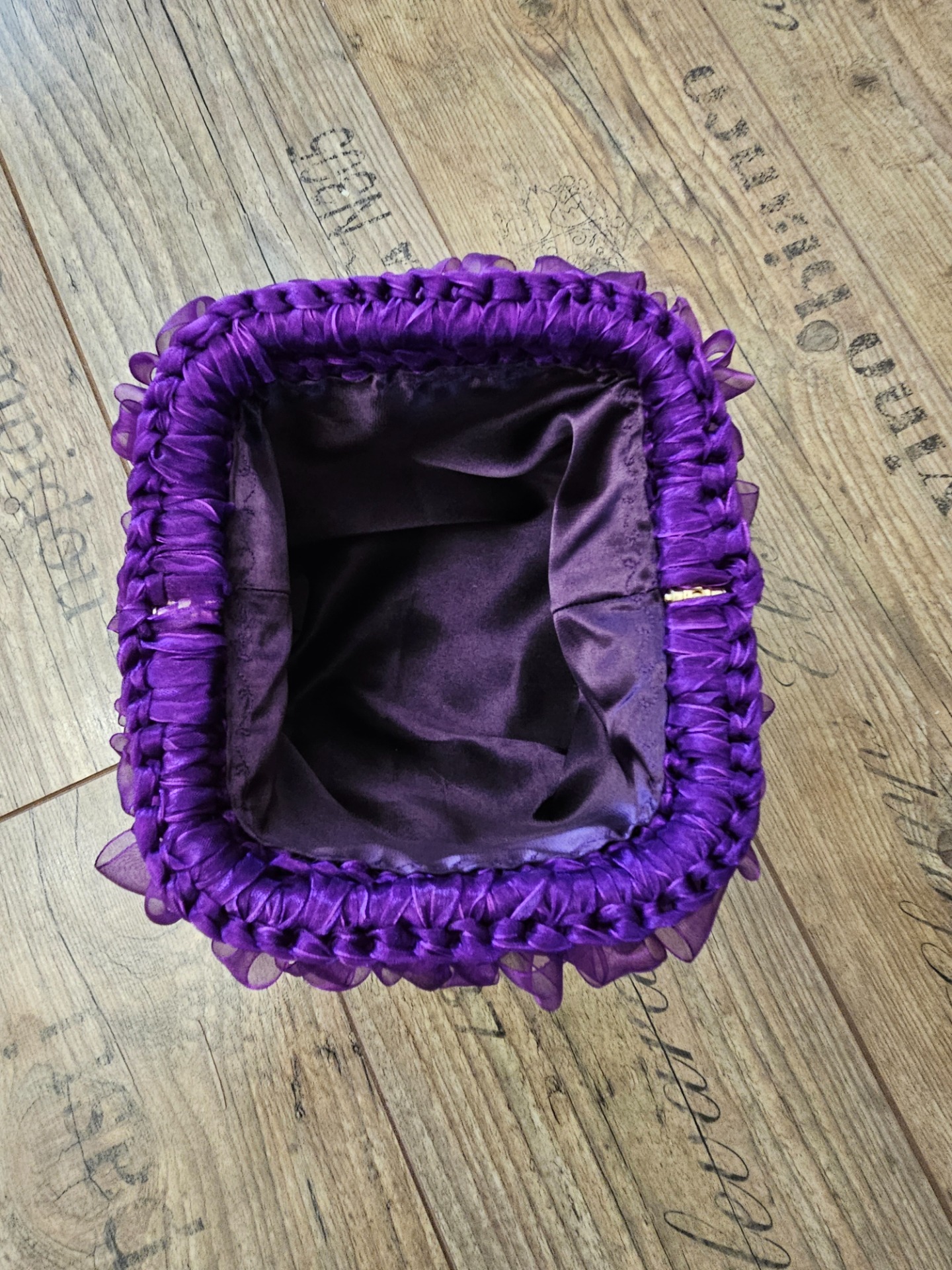 Elegantní, ručně háčkovaná kabelka pro milovnice elegance a extravagance ve tmavší fialové barvě, háčkovaná ze šifonových stuh. Díky nadýchané struktuře a jemnému lesku látky působí tato kabelka výjimečně a dodá šmrnc každému outfitu, je lehounká. Vnitřek kabelky polyesterový satén, hliníkový rám