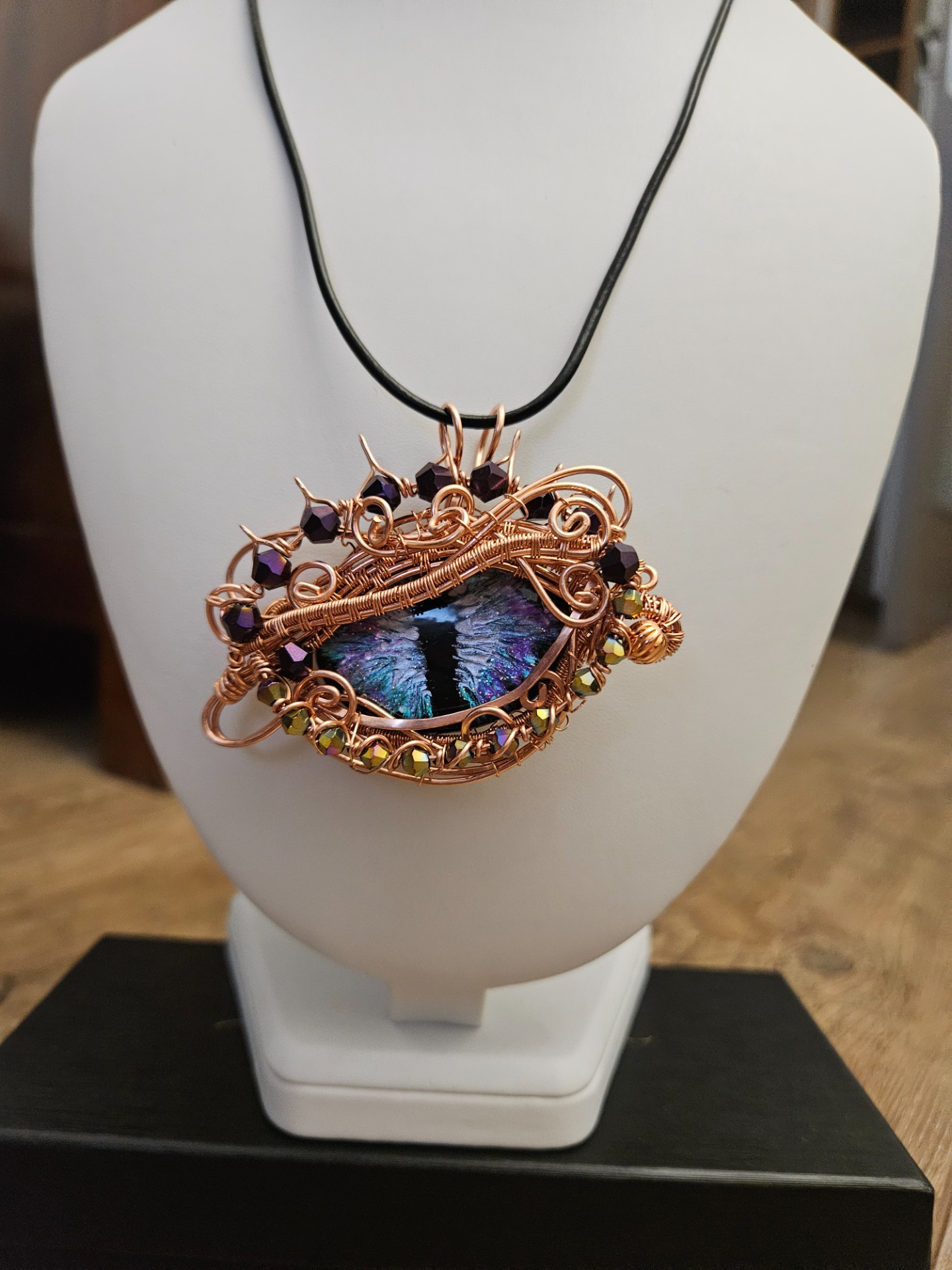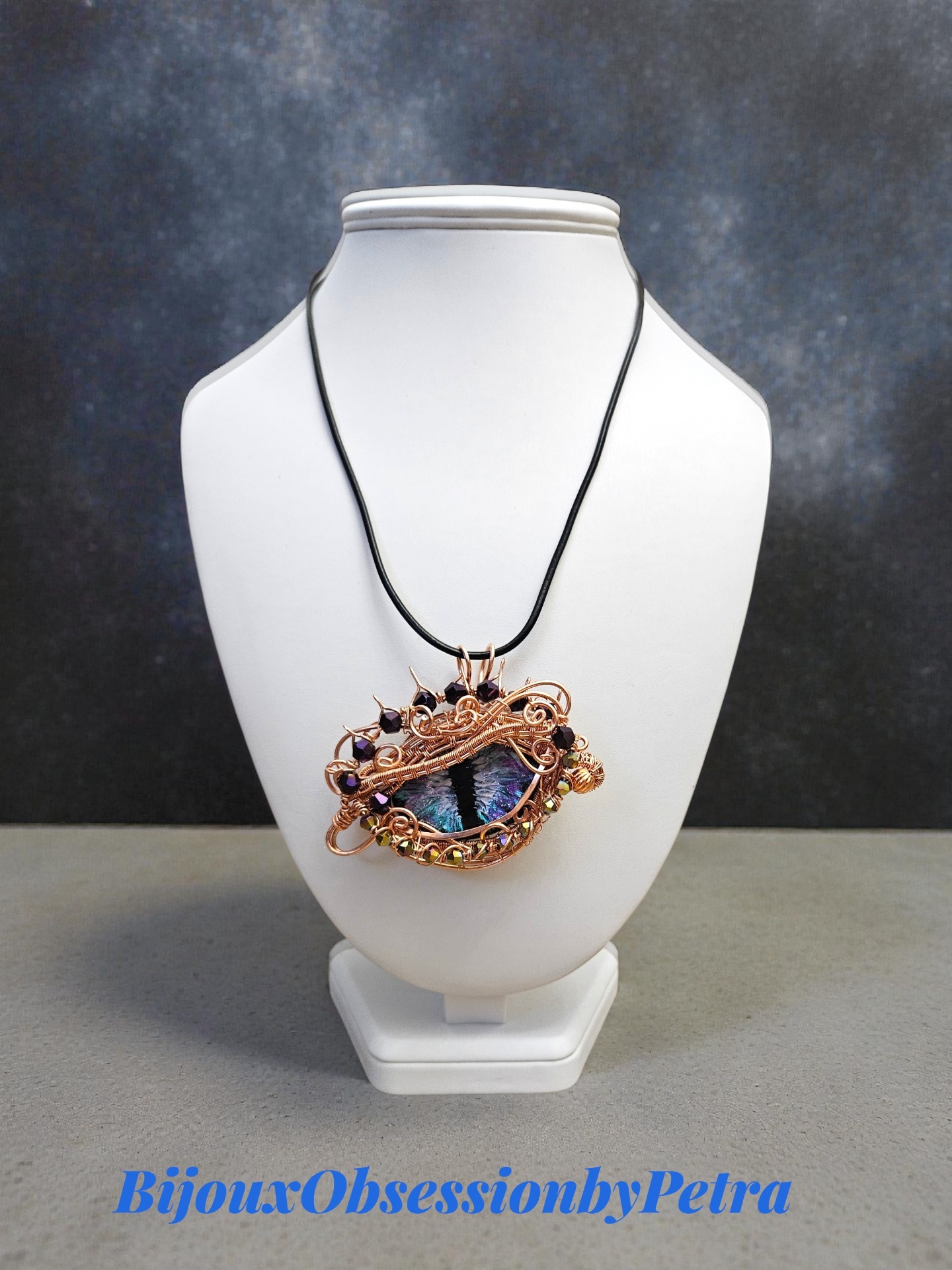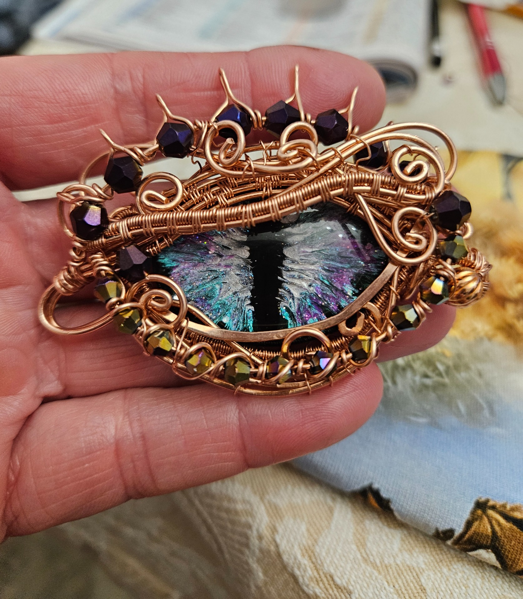 Tento náhrdelník je ihned k dispozici -dle inspirace Monsterance, vyrobený z nelakované mědi, délka řetízku cca 42cm, rozměry přívěsku - délka cca 7cm, výška cca 6cm. Měď na vzduchu přirozeně tmavne, proto dávám ke svým šperkům i leštící ubrousky. Šperk pak stačí přeleštit a bude opět jako nový, i když tato přirozená patina dodává mědi charakteristický vzhled a je také velmi krásná. Skleněné kabošony jsou ručně malované a proto je každý trochu jiný (není to strojová výroba a nedá se tedy 100% zopakovat). Šperk je ideální pro ty, kdo hledají výrazný, originální doplněk i pro milovníky magie a fantasy.