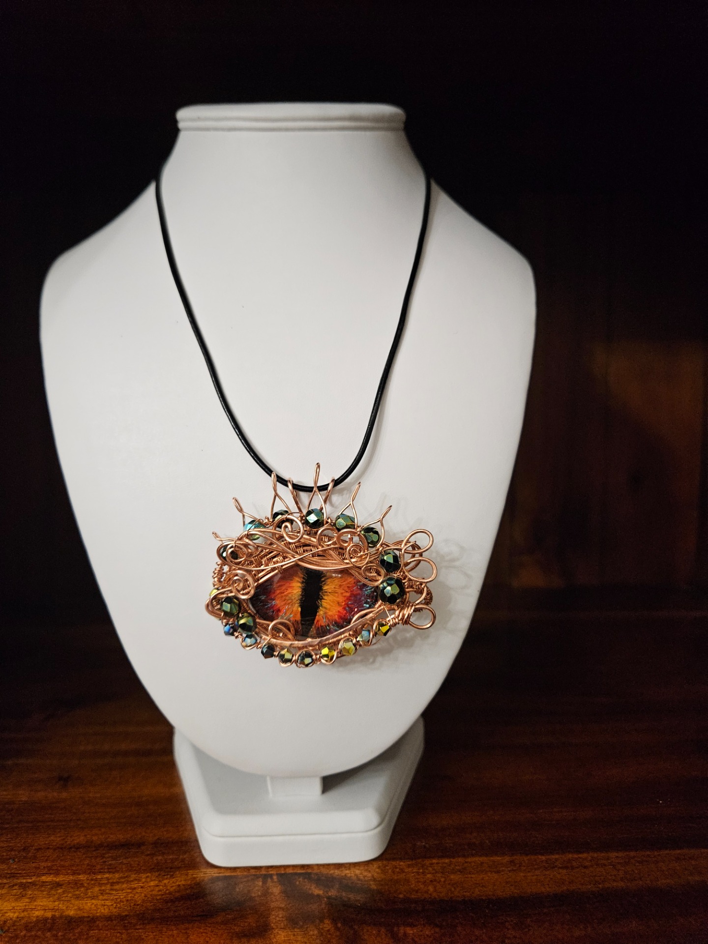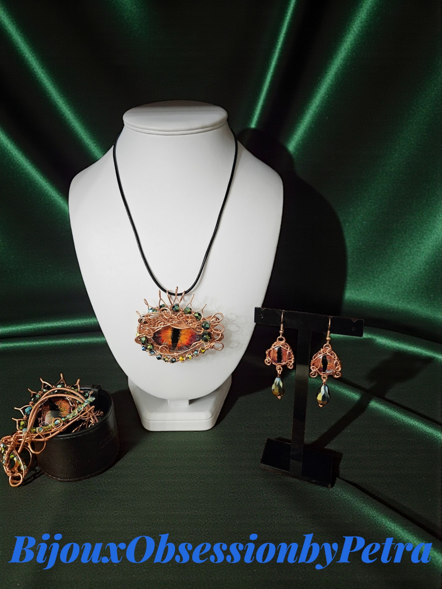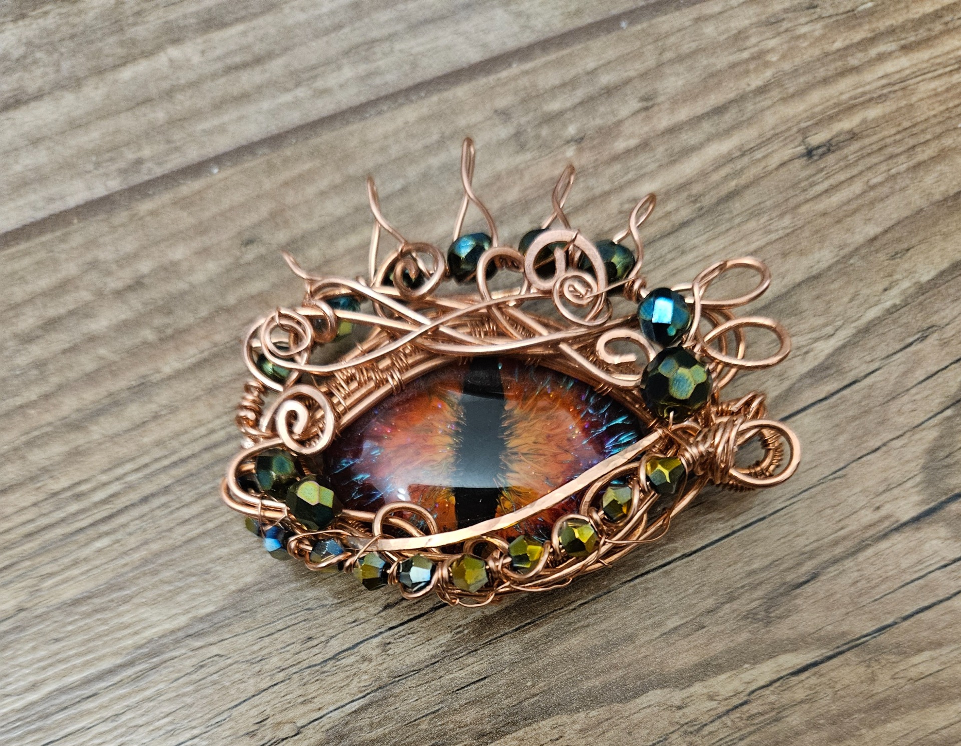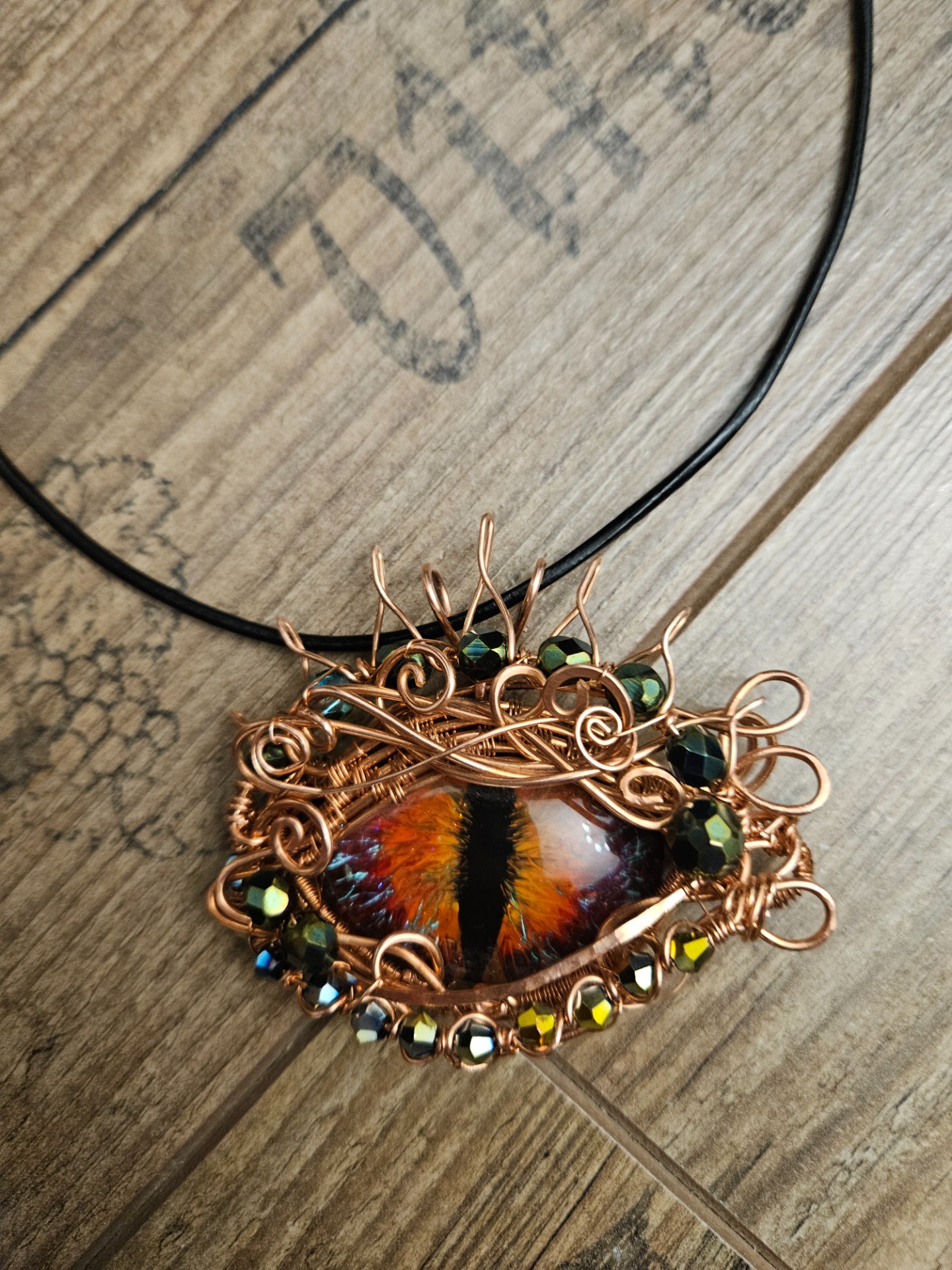 Tento náhrdelník je ihned k dispozici - je vyrobený z mědi, délka řetízku cca 42cm, rozměry přívěsku - délka cca 7cm, výška cca 6cm. Měď na vzduchu přirozeně tmavne, proto dávám ke svým šperkům i leštící ubrousky. Šperk pak stačí přeleštit a bude opět jako nový, i když tato přirozená patina dodává mědi charakteristický vzhled a je také velmi krásná. Skleněné kabošony jsou ručně malované a proto je každý trochu jiný (není to strojová výroba a nedá se tedy 100% zopakovat). Šperk je ideální pro ty, kdo hledají výrazný, originální doplněk i pro milovníky magie a fantasy.