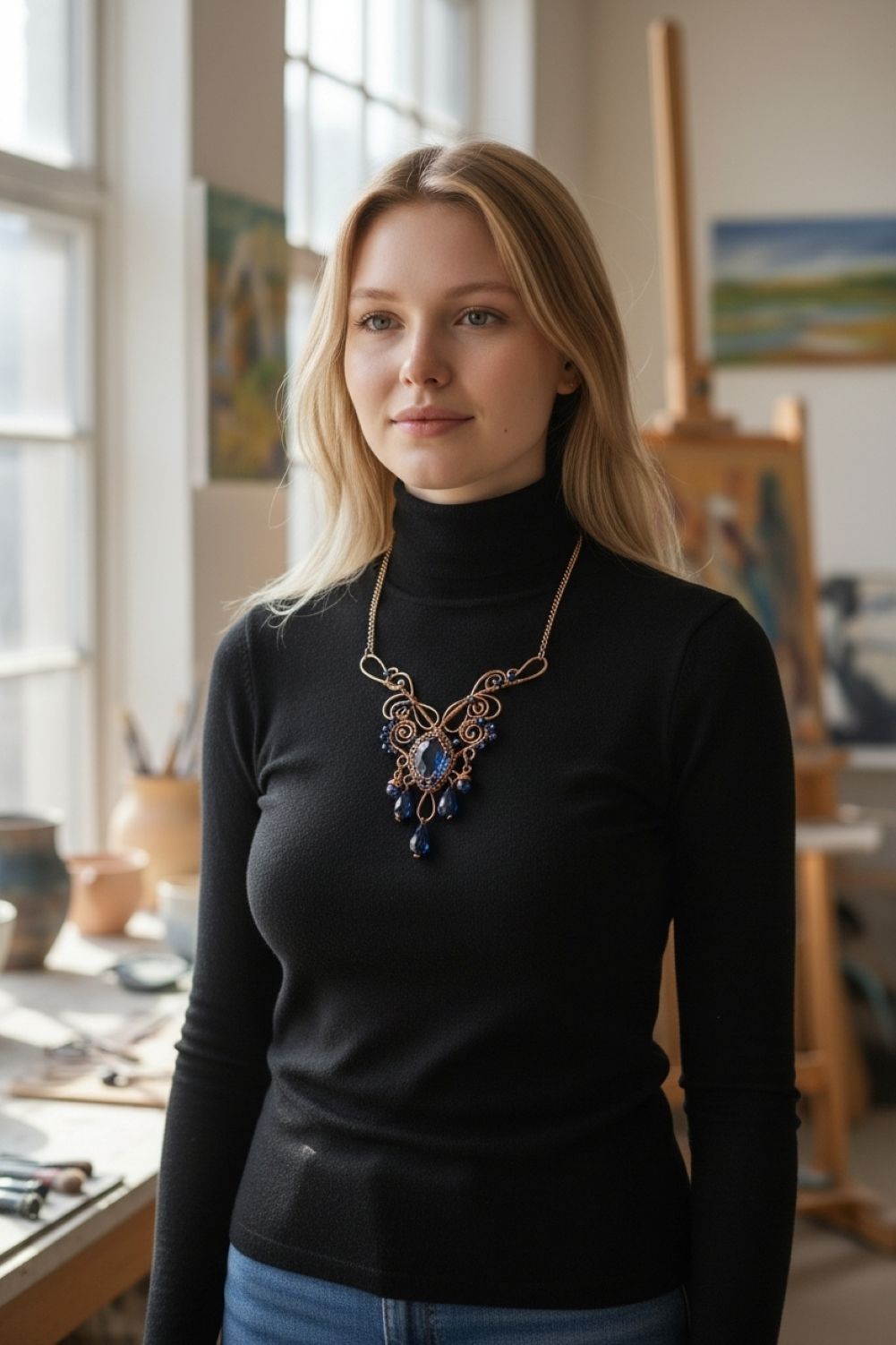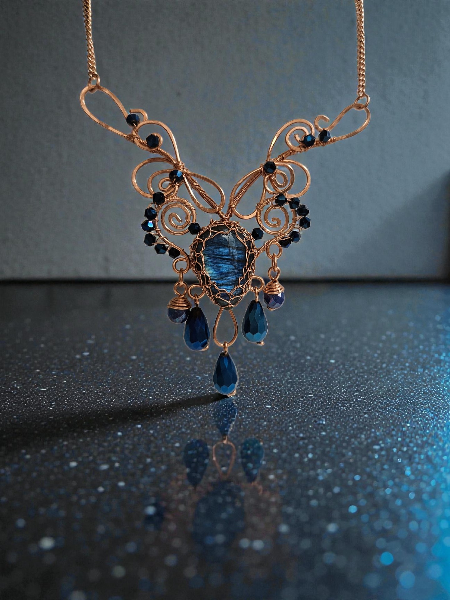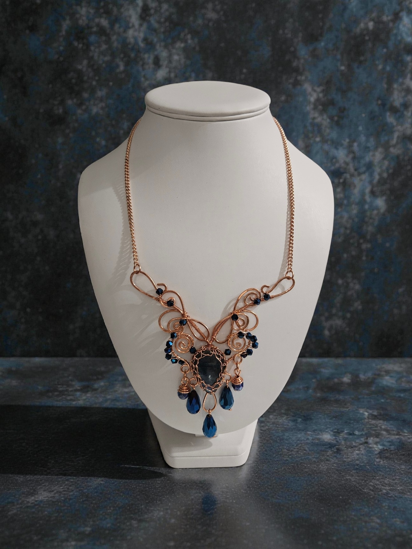 Náhrdelník je ručně vyráběný technikou wire wrapping, s bohatě zdobenými křivkami inspirovanými secesí. Měděný drát je tvarován do organických spirál a doplněn tmavě modrými broušenými korálky, které podtrhují hloubku a tajemnost centrálního kamene. Jemné kapkovité přívěsky dodávají šperku lehkost a pohyb.
