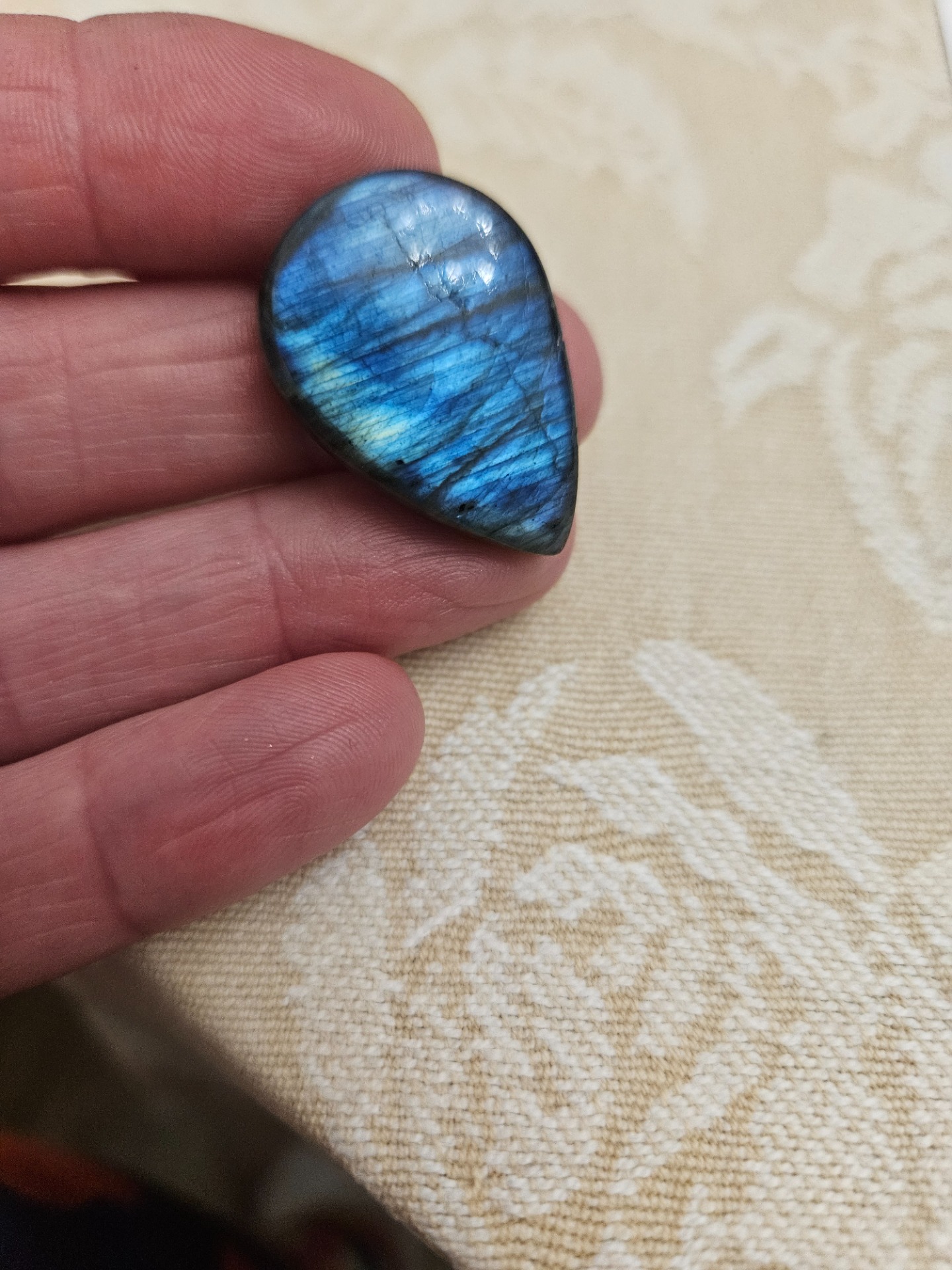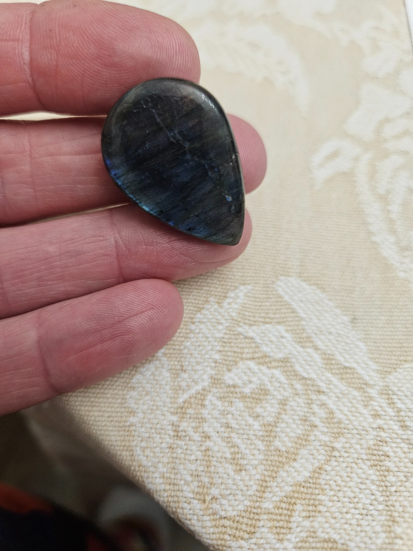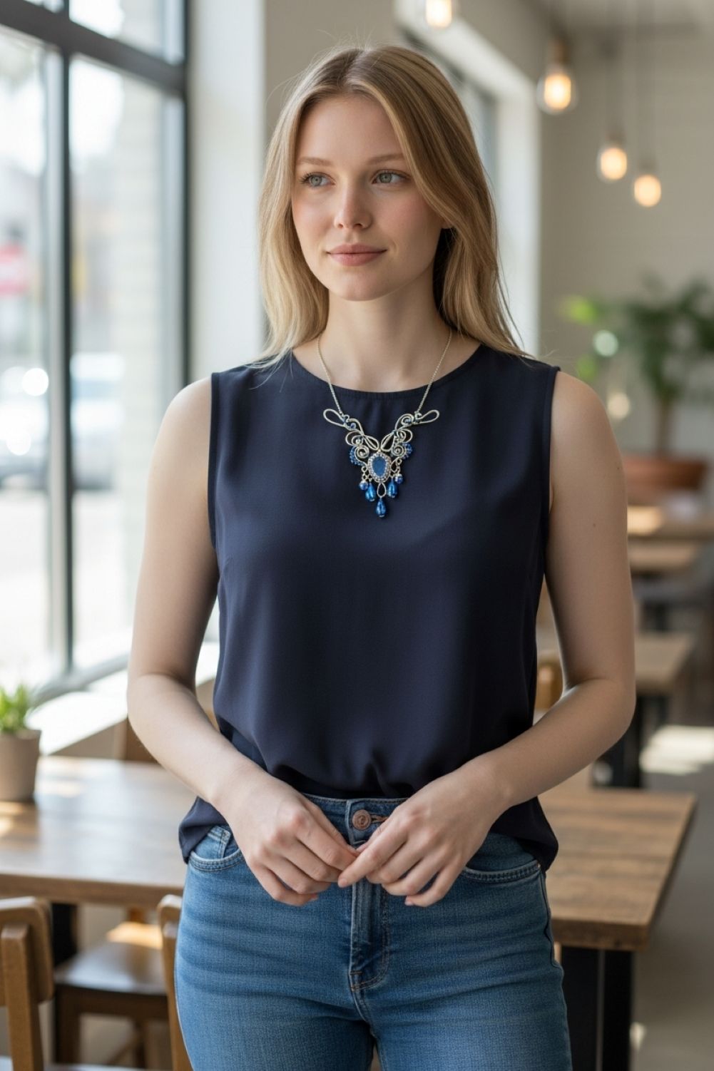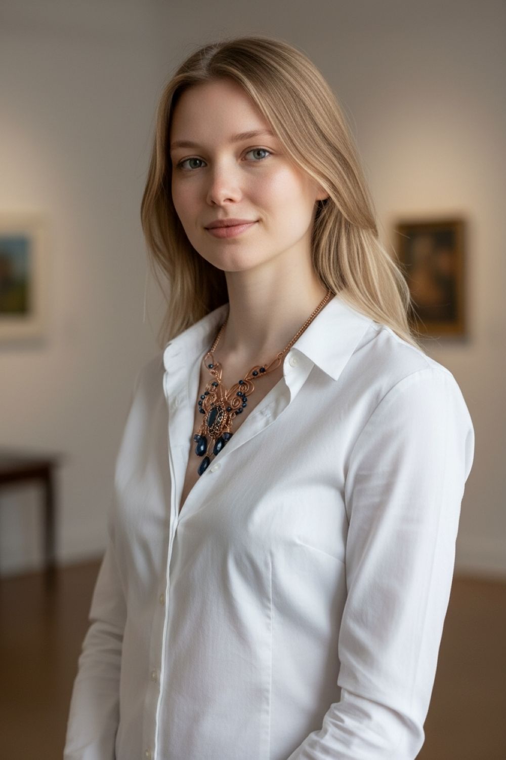 Náhrdelník je ručně vyráběný technikou wire wrapping, s bohatě zdobenými křivkami inspirovanými secesí. Měděný drát je tvarován do organických spirál a doplněn tmavě modrými broušenými korálky, které podtrhují hloubku a tajemnost centrálního kamene. Jemné kapkovité přívěsky dodávají šperku lehkost a pohyb.