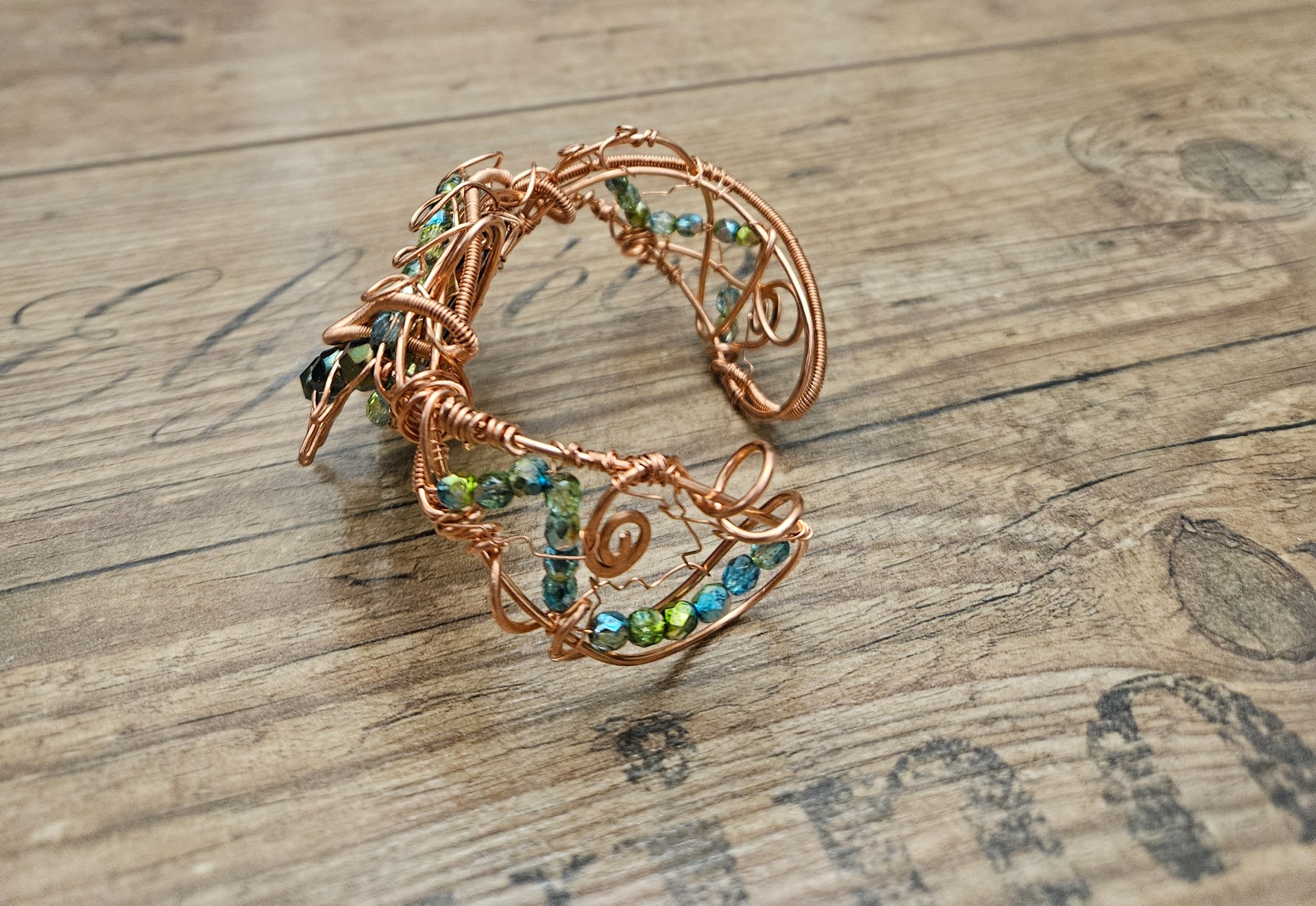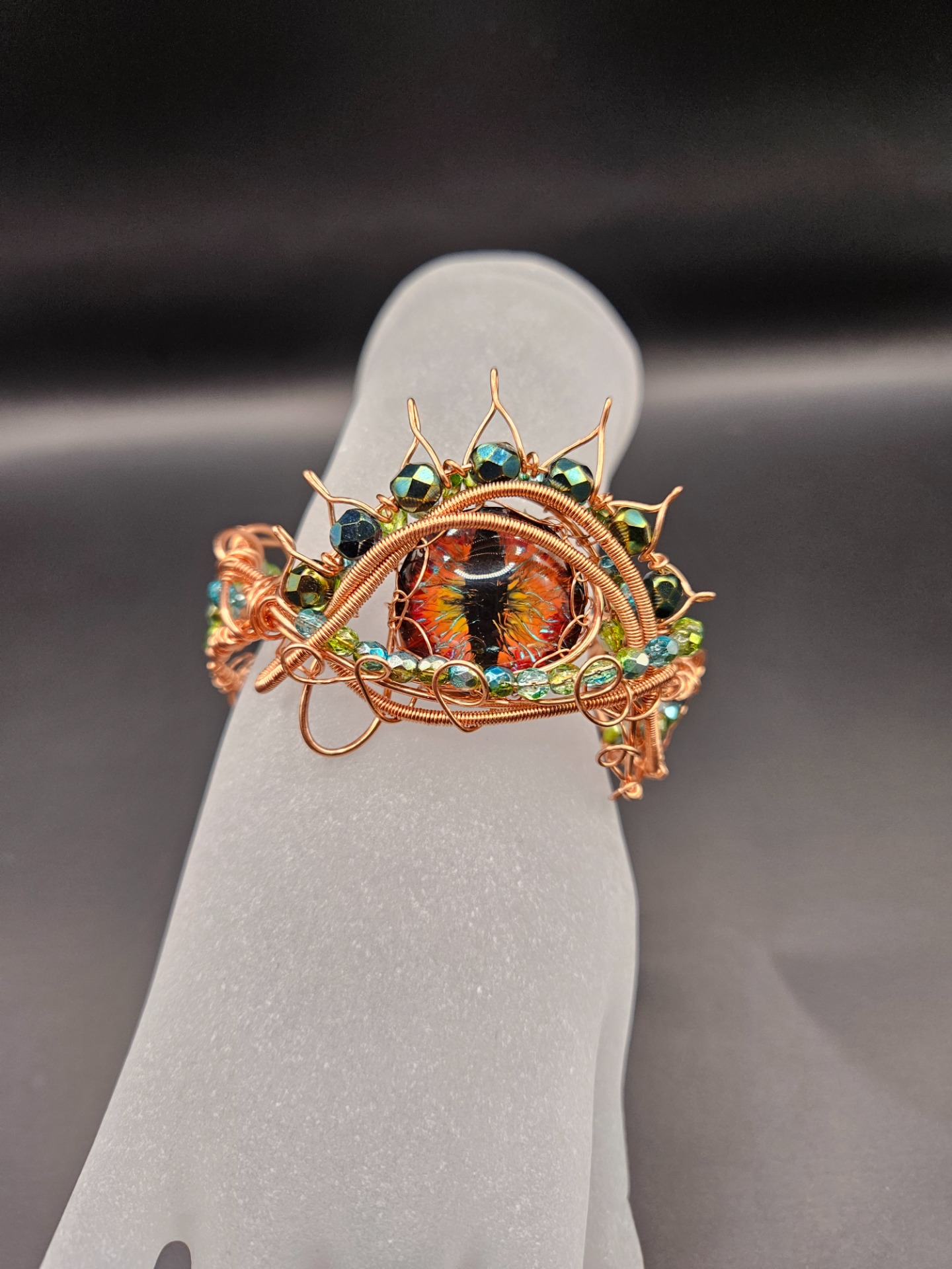 Tento náramek je ihned k dispozici - je vyrobený z mědi, na zápěstí cca 17 cm ( dá se ještě cca o 2 cm přizpůsobit) .Měď na vzduchu přirozeně tmavne, proto dávám ke svým šperkům i leštící ubrousky. Šperk pak stačí přeleštit a bude opět jako nový, i když tato přirozená patina dodává mědi charakteristický vzhled a je také velmi krásná. Skleněné kabošony jsou ručně malované a proto je každý trochu jiný (není to strojová výroba a nedá se tedy 100% zopakovat). Šperk je ideální pro ty, kdo hledají výrazný, originální doplněk i pro milovníky magie a fantasy.