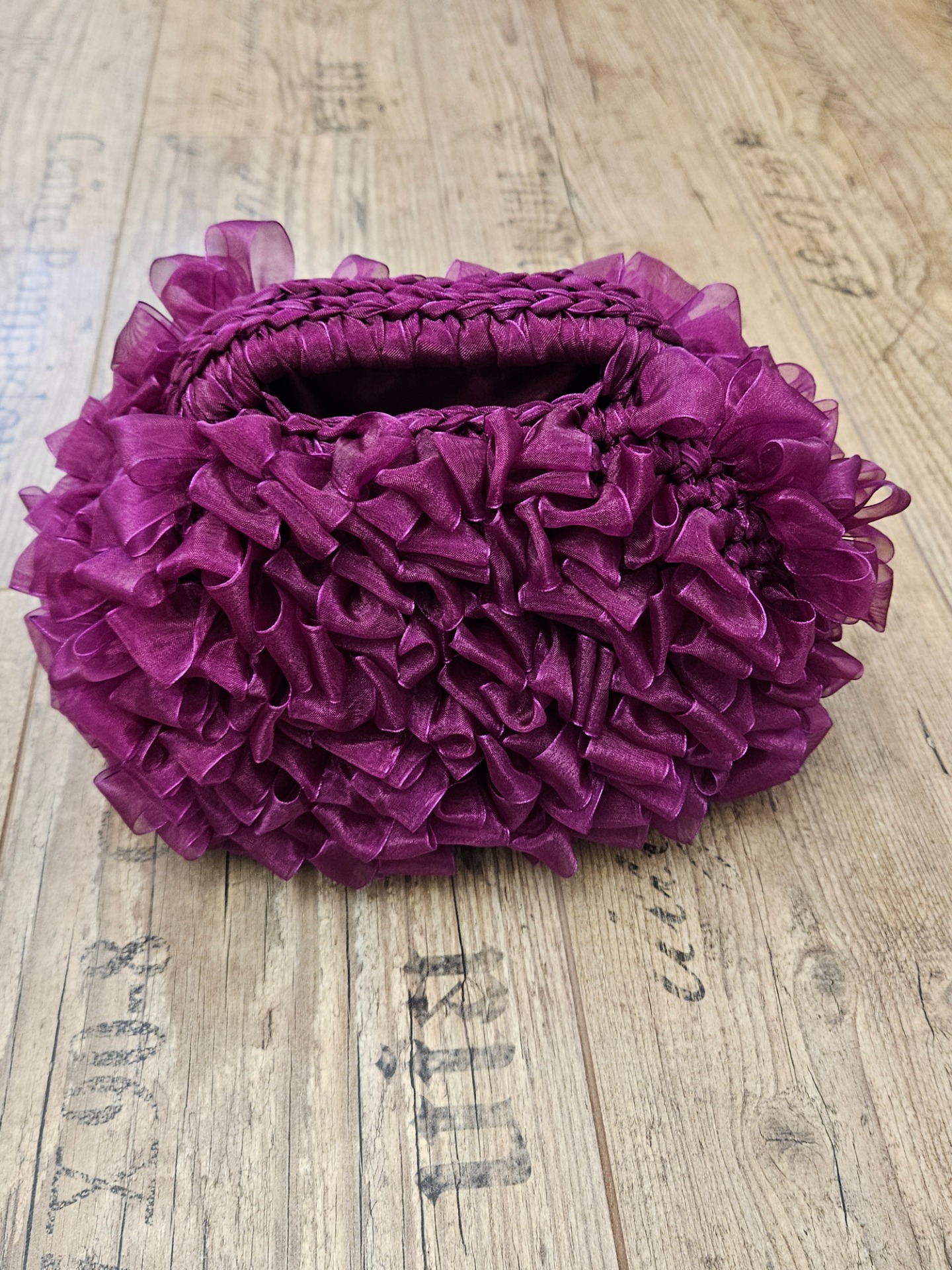 Elegantní, ručně háčkovaná kabelka pro milovnice elegance a extravagance ve švestkové barvě, háčkovaná ze šifonových stuh. Díky nadýchané struktuře a jemnému lesku látky působí tato kabelka výjimečně a dodá šmrnc každému outfitu, je lehounká. Vnitřek kabelky polyesterový satén, hliníkový rám