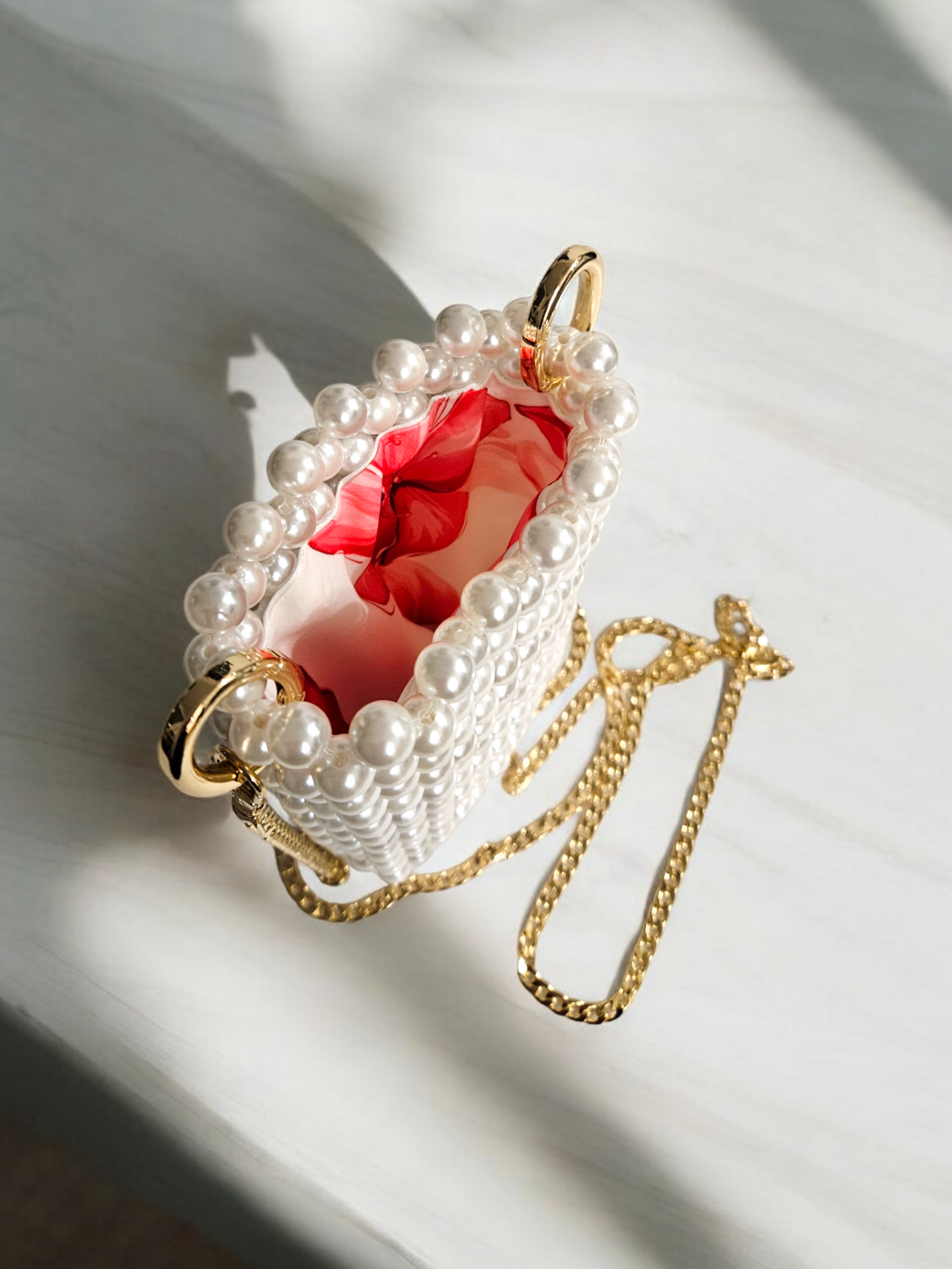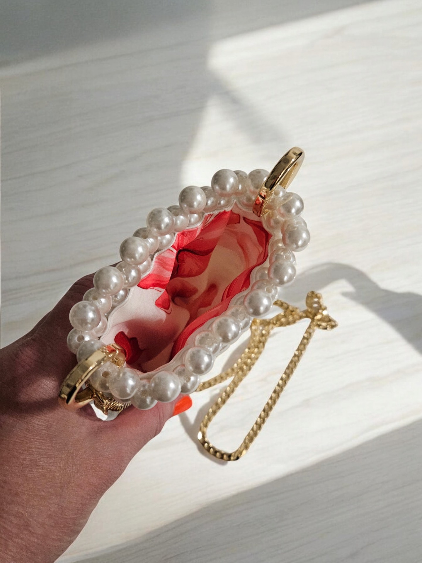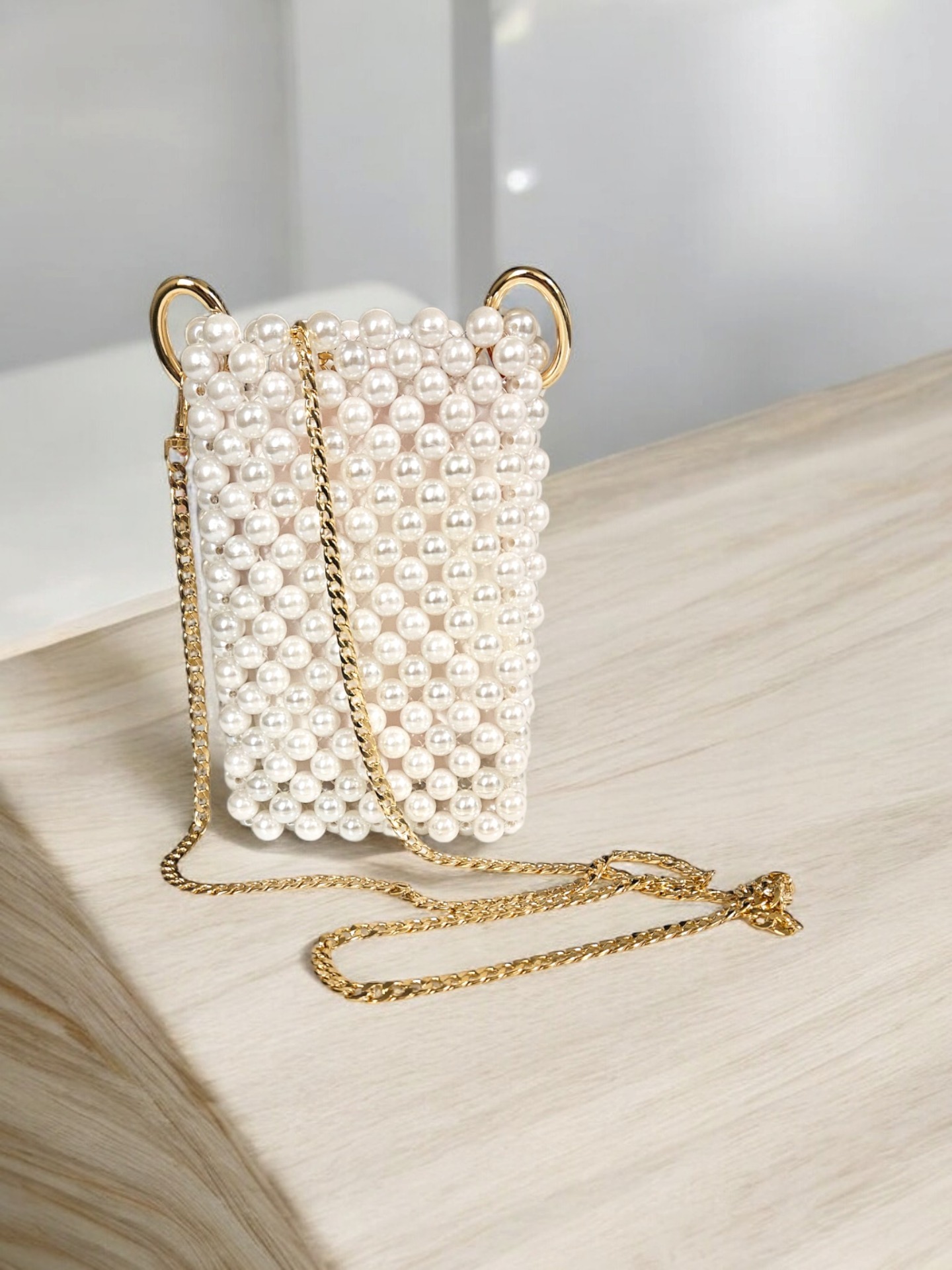 Elegantní pouzdro na mobilní telefon (nebo jiné drobnosti) s vnitřní podšívkou, plastové perle, bižuterní komponenty a řetízek, taštička výška 18cm, šířka 10cm, hloubka 3cm, délka řetízku 120 cm