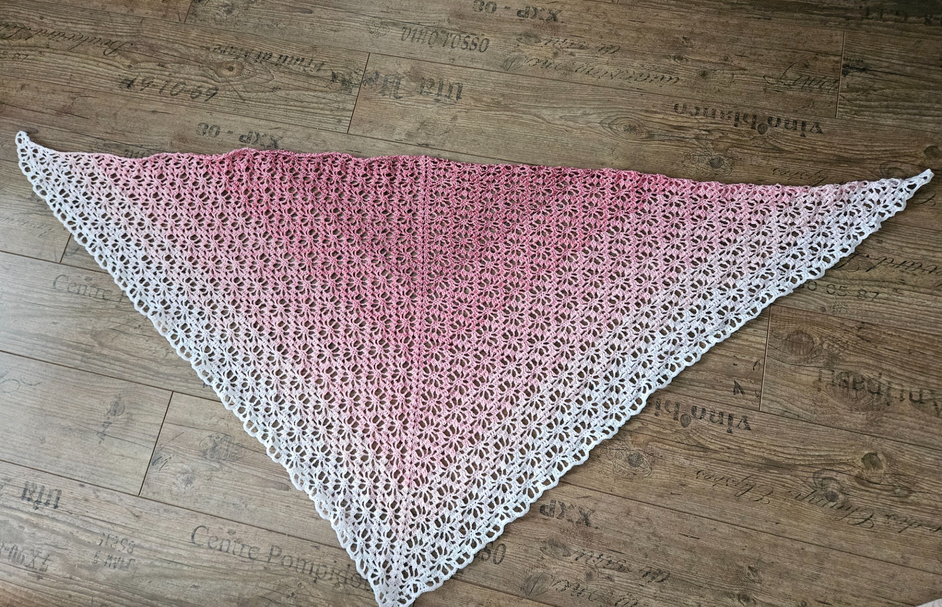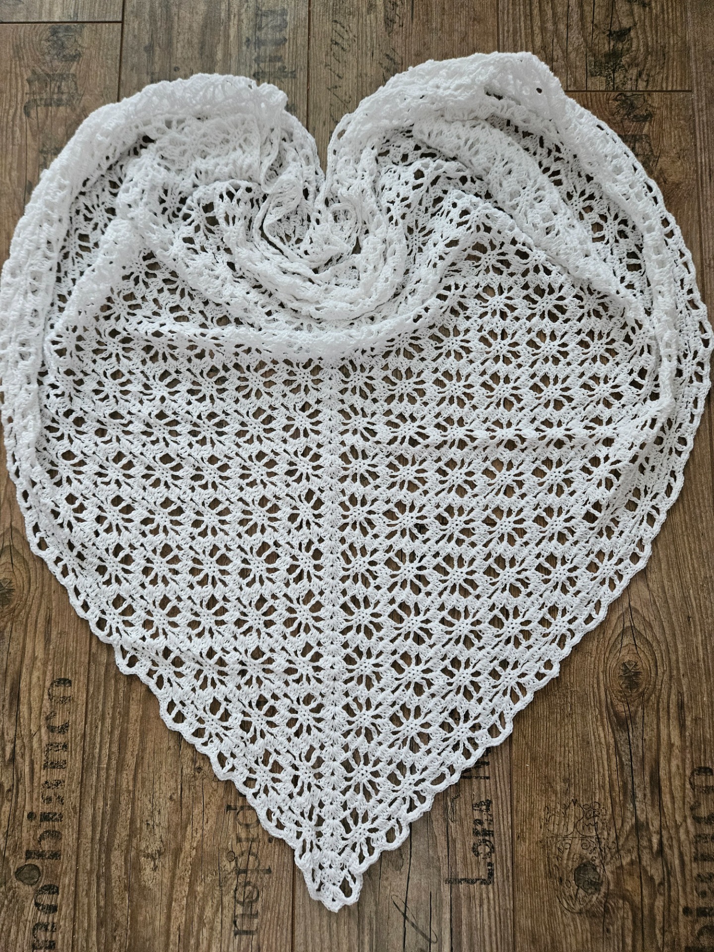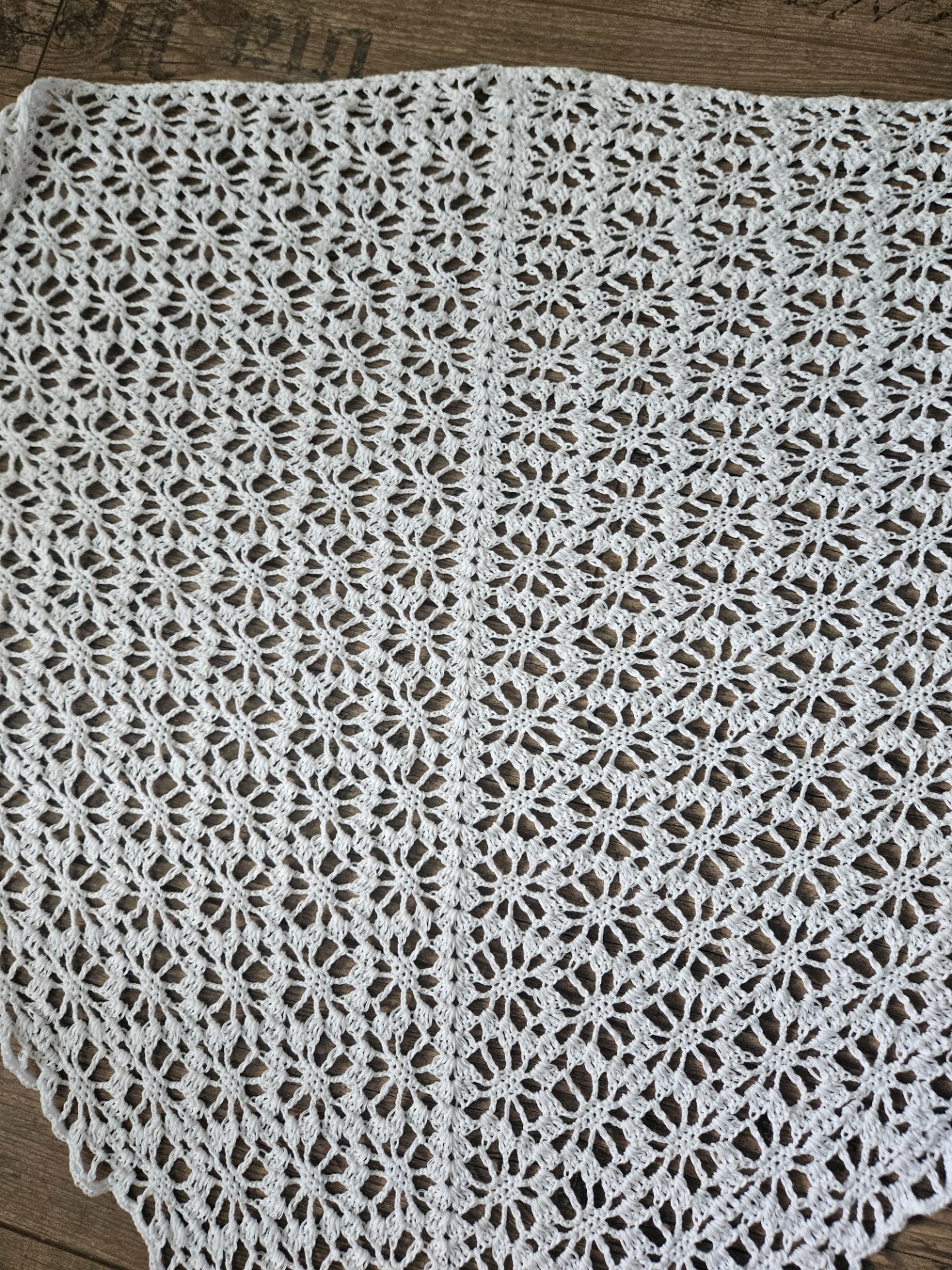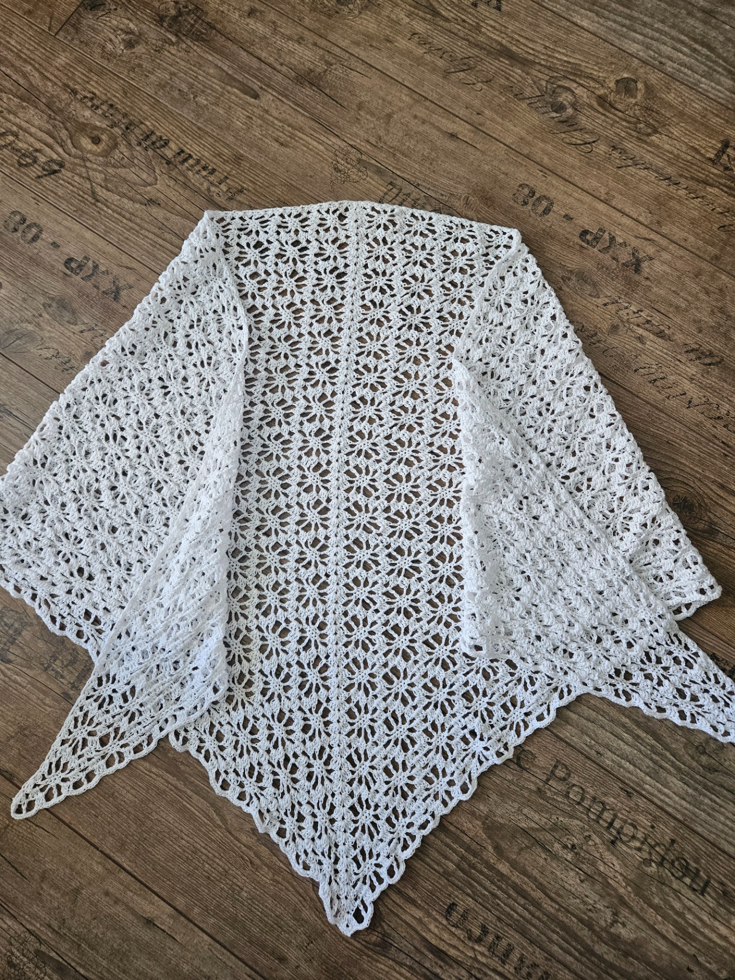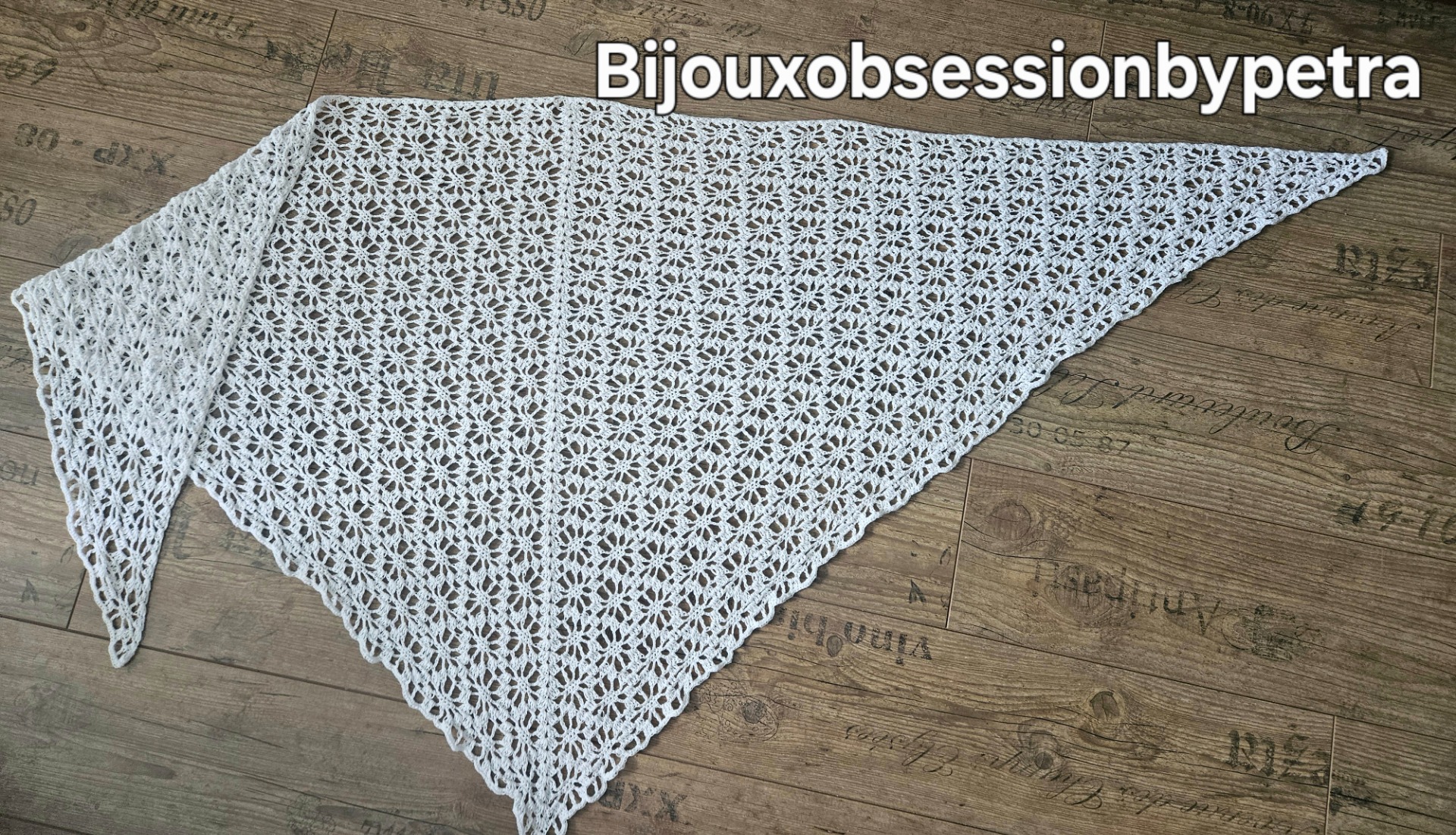 ručně háčkovaný,romantický šál, vhodný i na společenské šaty. Šál je poměrně velký délka 205 cm, výška 92cm. Příze 50% bavlna, 50%polyakryl
