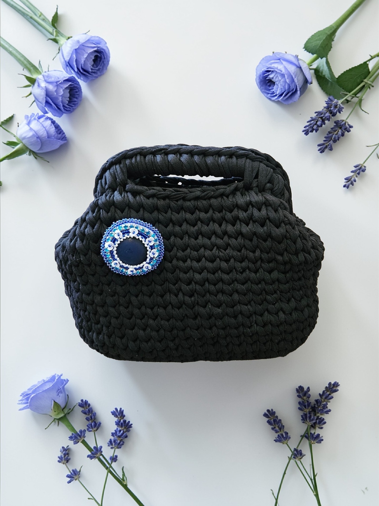 Elegantní háčkovaná kabelka, která spojuje ruční práci s originálním šperkem.