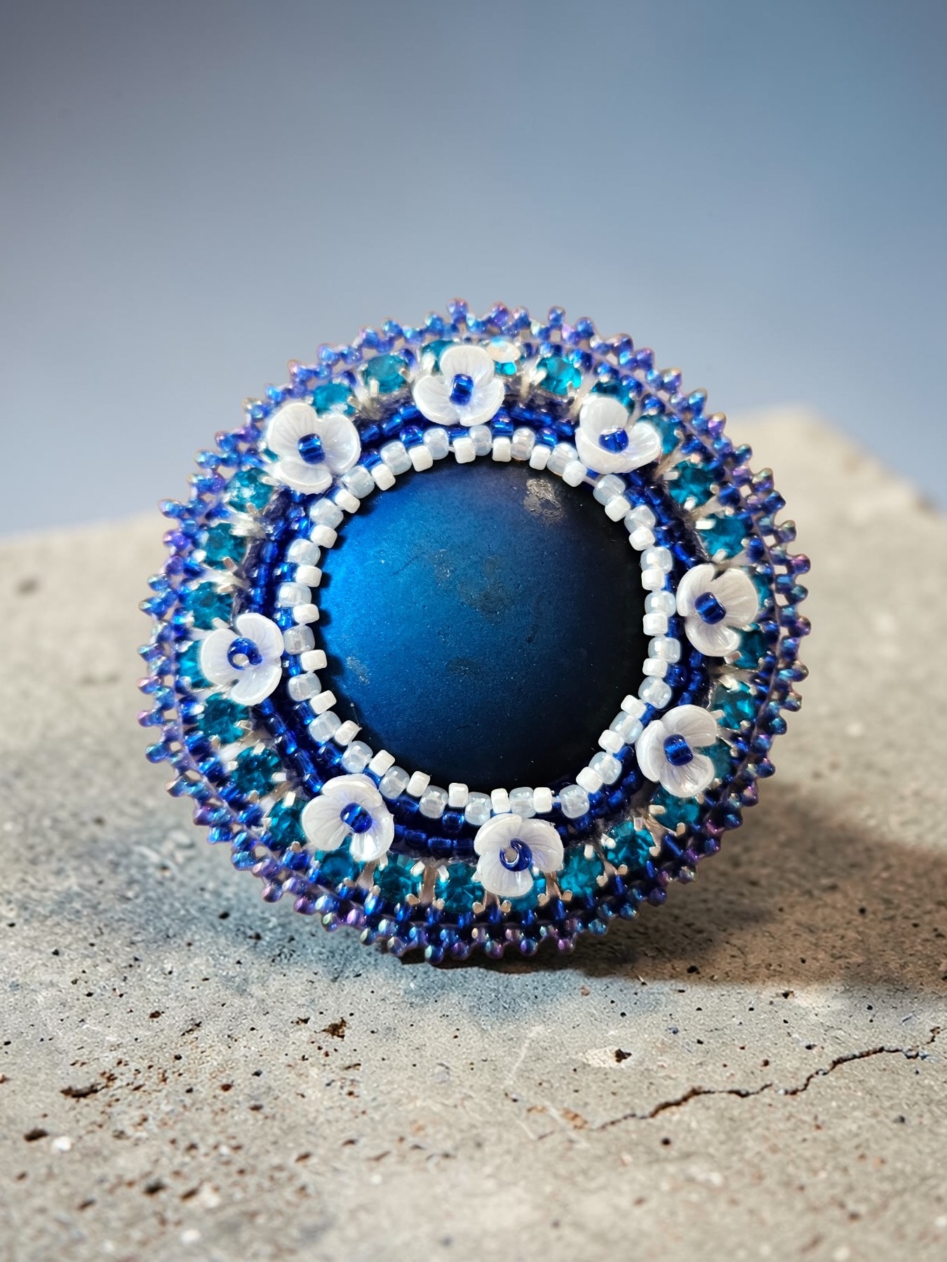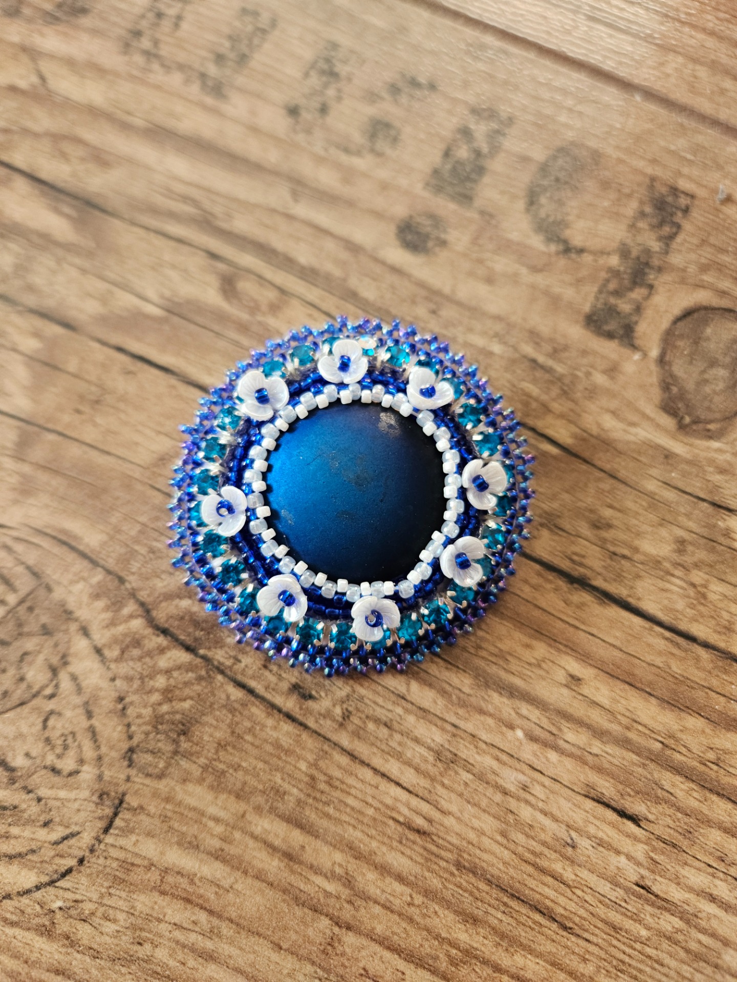 Kabelka je ručně háčkovaná z pevné příze a doplněná výraznou broží, která je zároveň samostatným šperkem. Brož tvoří skleněný kabošon ručně obšitý japonskými korálky Toho, štrasovým řetízkem a drobnými plastovými kytičkami.