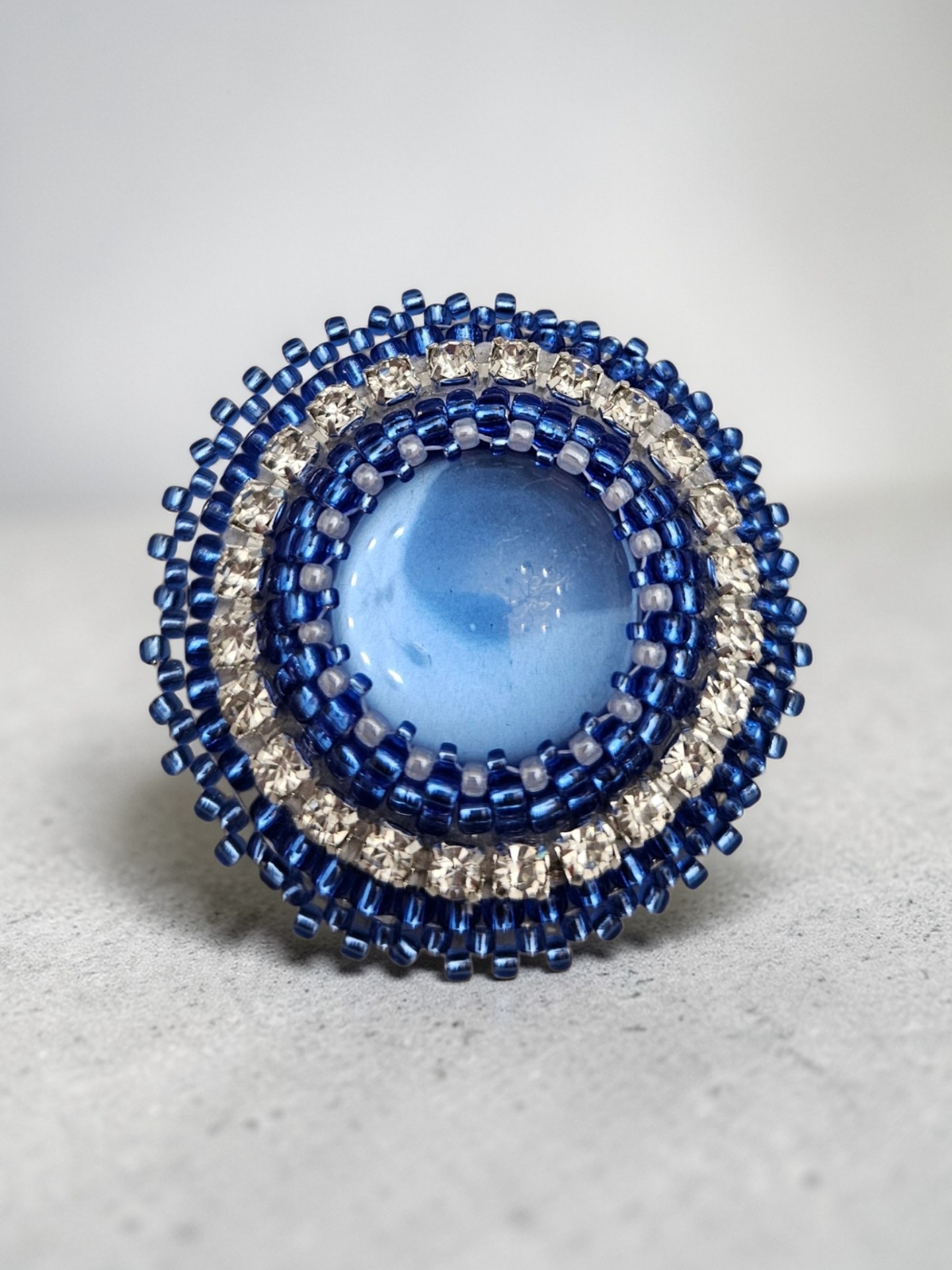 Dominantou brože je skleněný kabošon v jemném modrém odstínu, který je precizně obšitý kvalitními japonskými korálky Toho. Celý design doplňuje štrasový řetízek, jenž dodává šperku luxusní třpyt a hloubku.