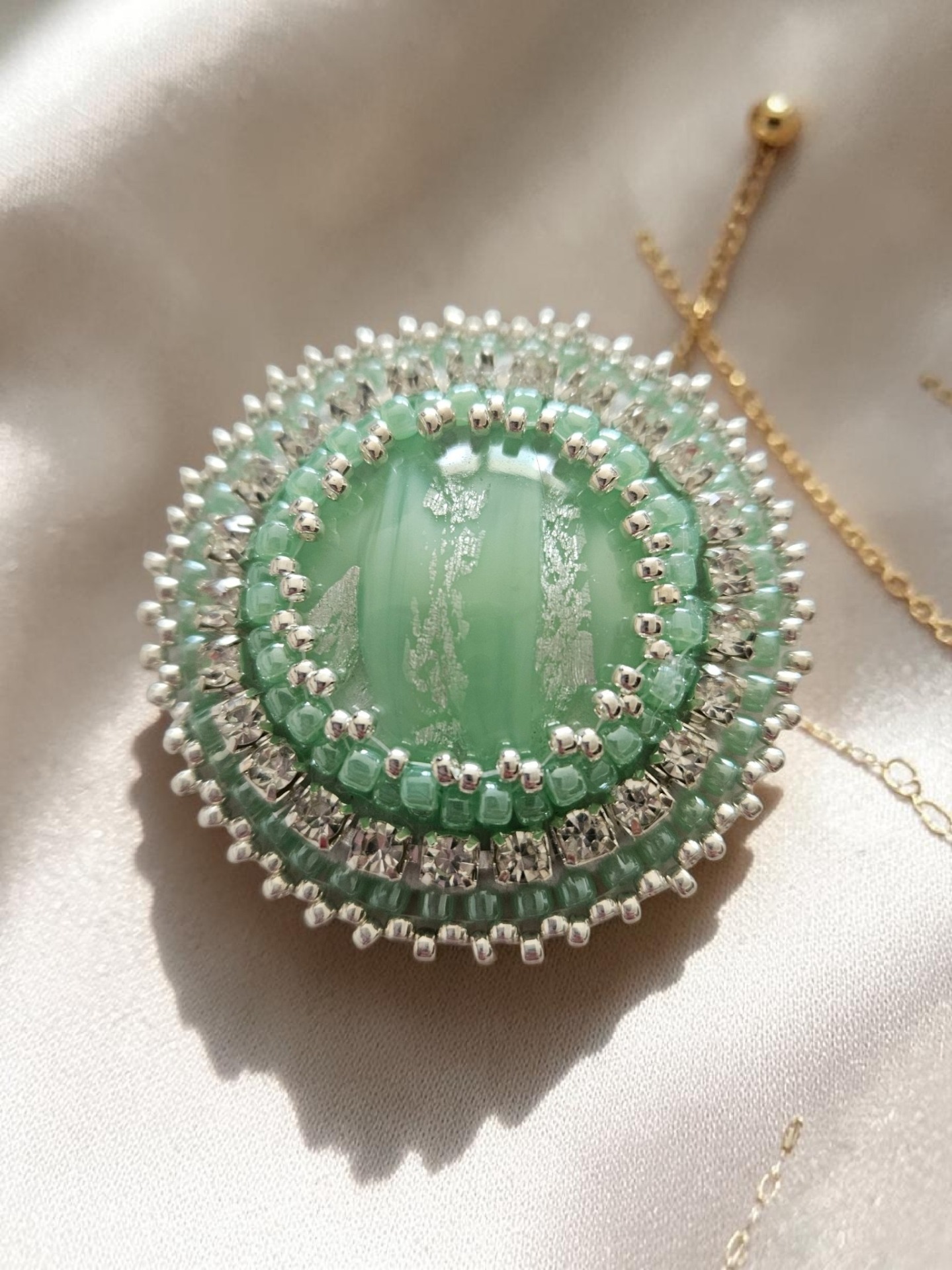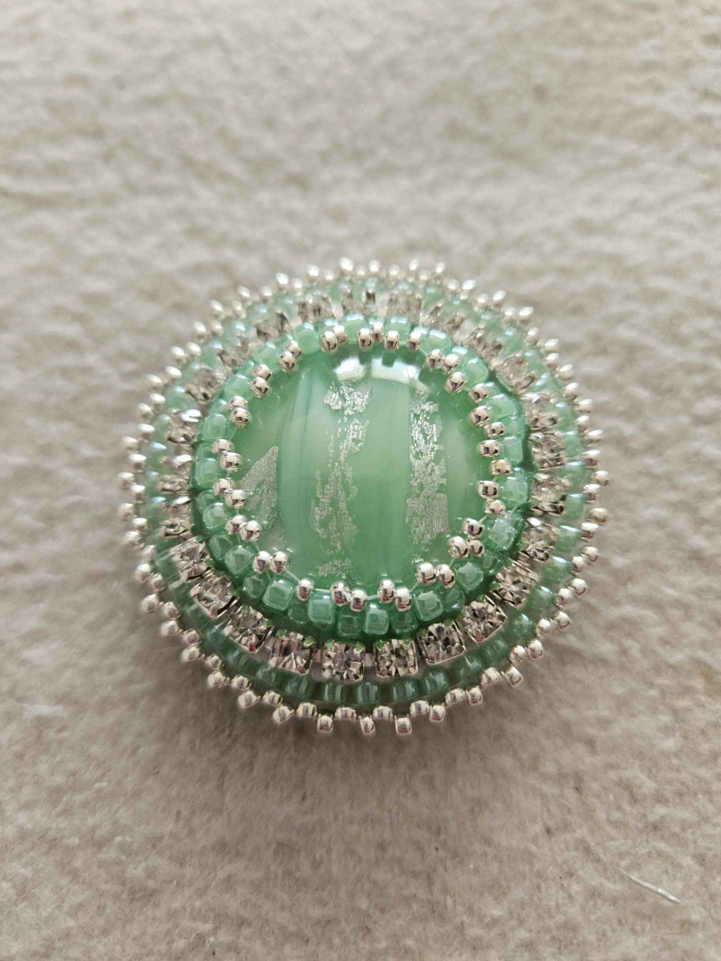 Dominantou šperku je skleněný kabošon s plátky stříbra, které vytvářejí jedinečný vzor. Kabošon je pečlivě obšitý japonskými skleněnými korálky Toho, které jsou známé svou vysokou kvalitou a pravidelným tvarem.
