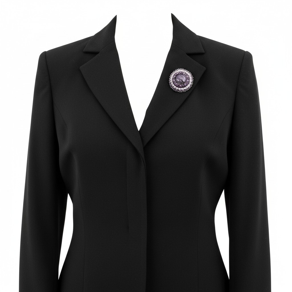 Ručně šitá brož s výrazným skleněným kabošonem, obšitým prémiovým japonským skleněným rokajlem TOHO, je navržena pro ženy, které preferují čistý styl, kvalitu a osobitost. Obšití je doplněno štrasovým řetízkem, jenž vytváří jemný třpytivý efekt a podtrhuje elegantní charakter celého šperku.