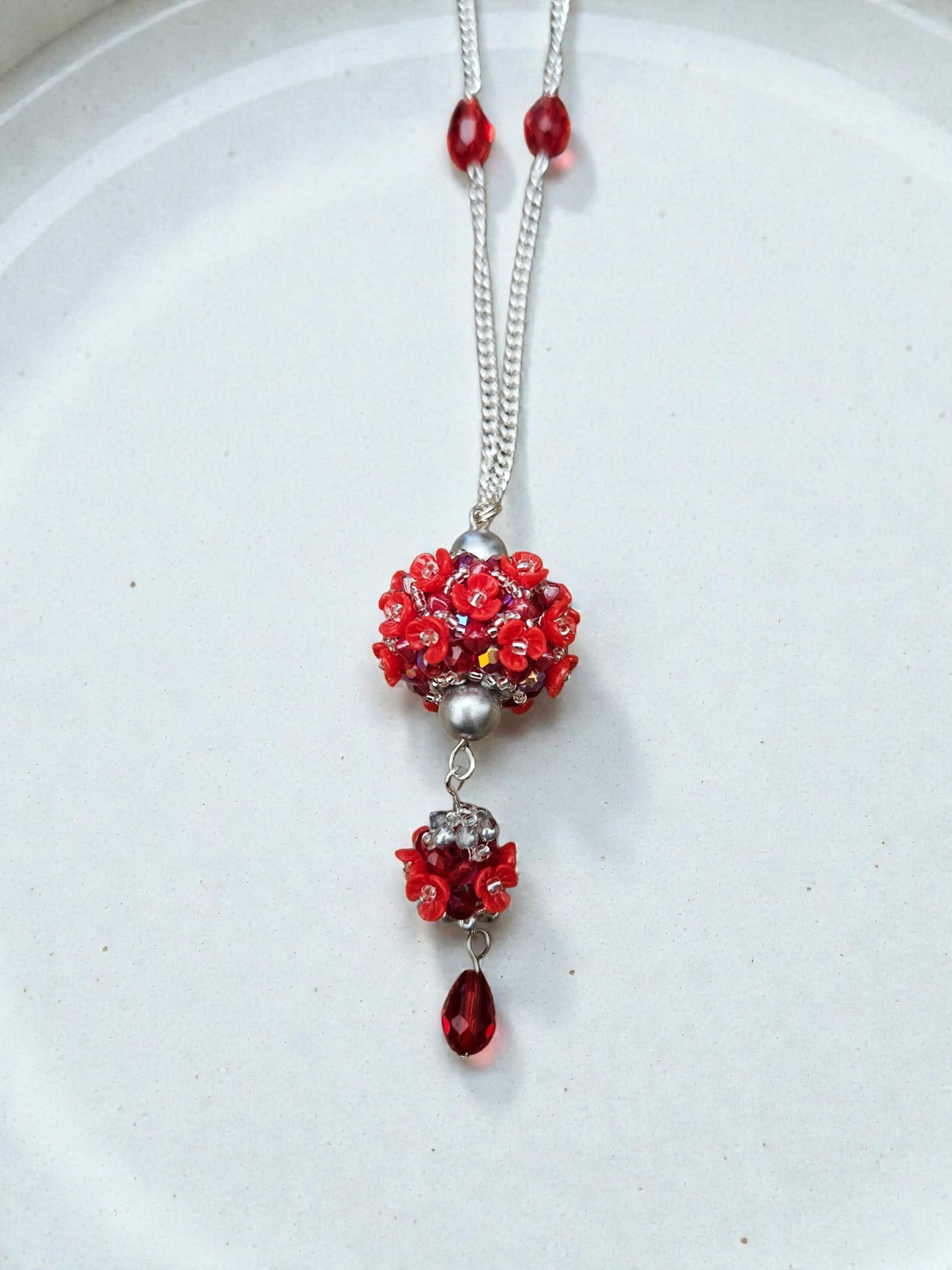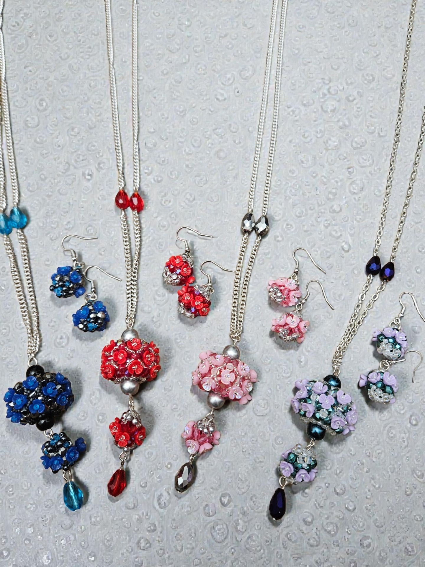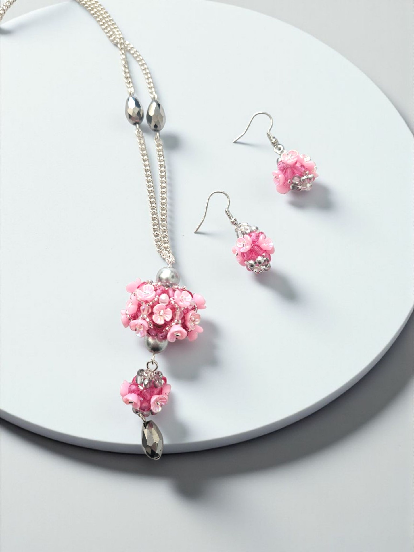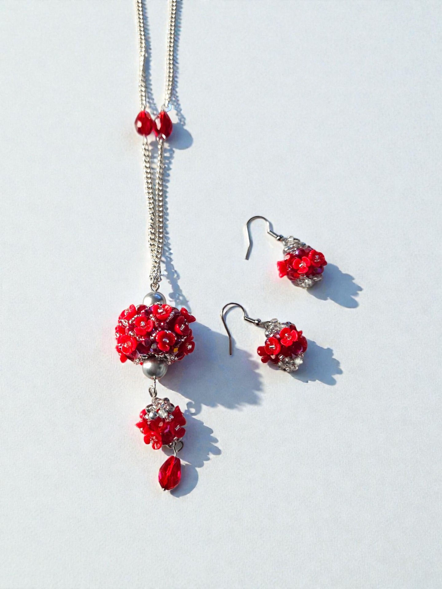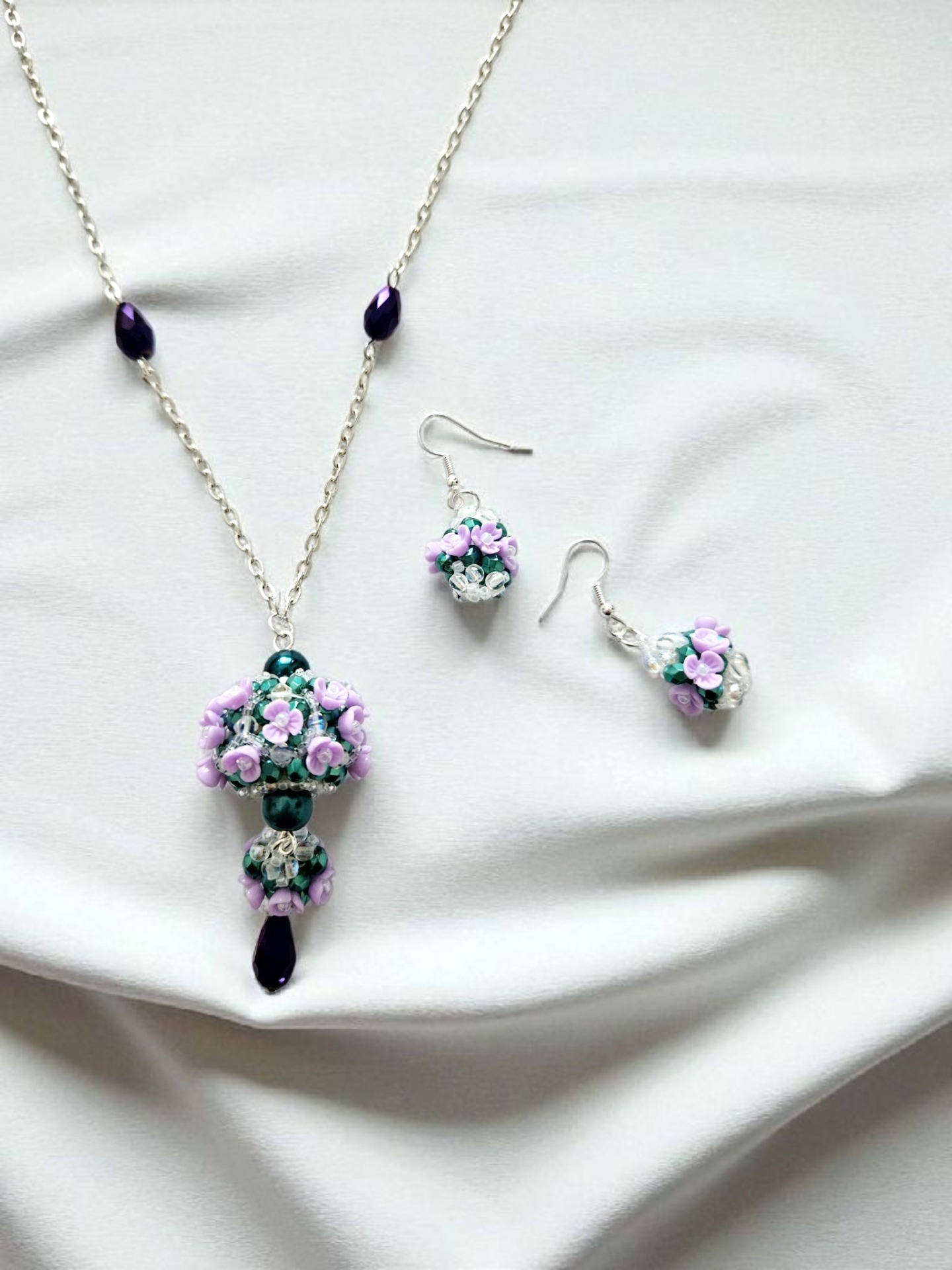 Elegantní sada květinového náhrdelníku a náušnic, vyrobeno z japonských korálků Toho, broušené kapky, ohňovek, bižuterní řetízek a zapínání, délka řetízku cca 2x 34cm plus závěs cca 7cm, délka náušnic včetně zapínání cca 7,5cm. Šperk je ideální pro slavnostní příležitosti, ale i jako originální doplněk k jednoduchému outfitu.