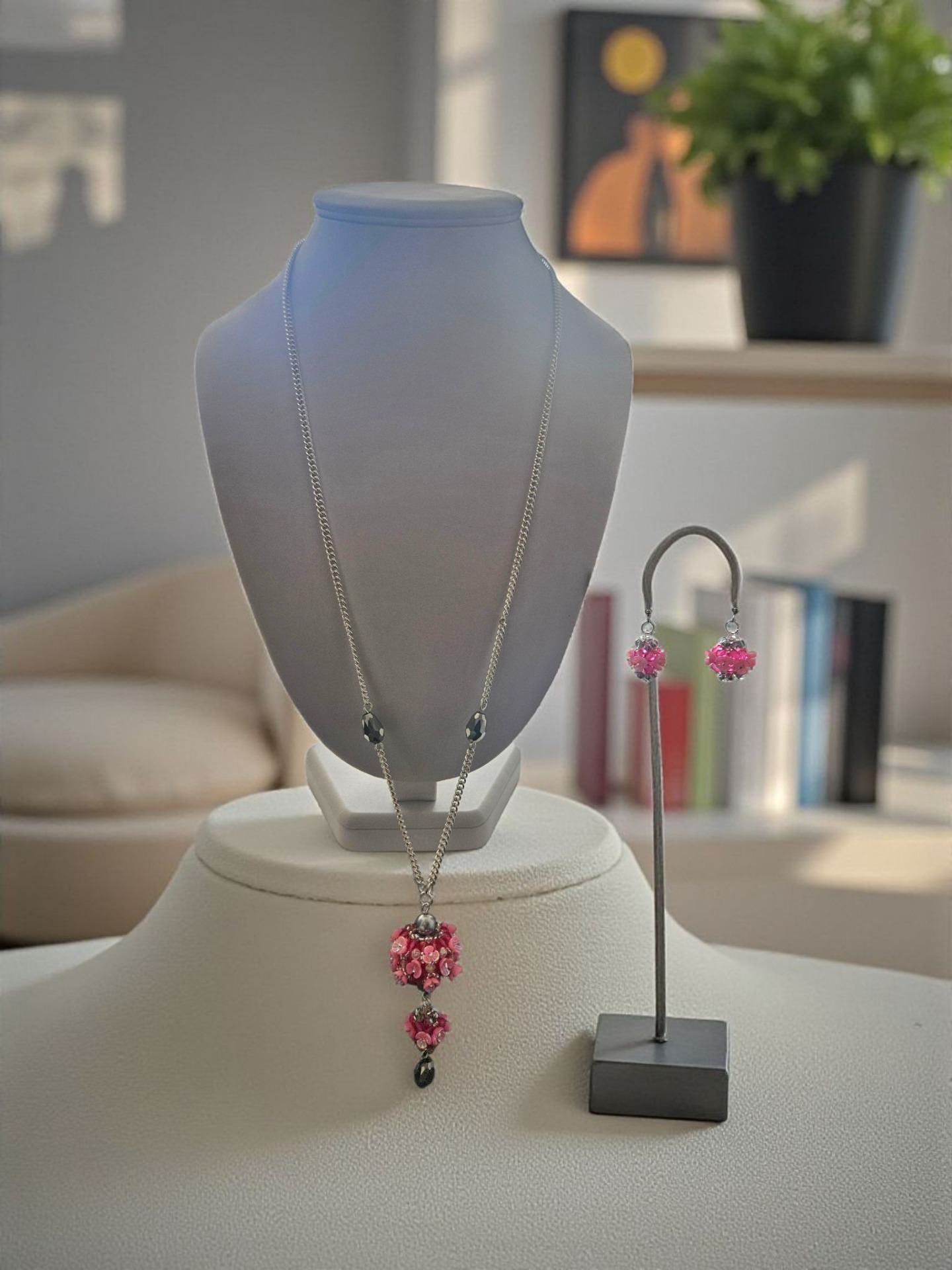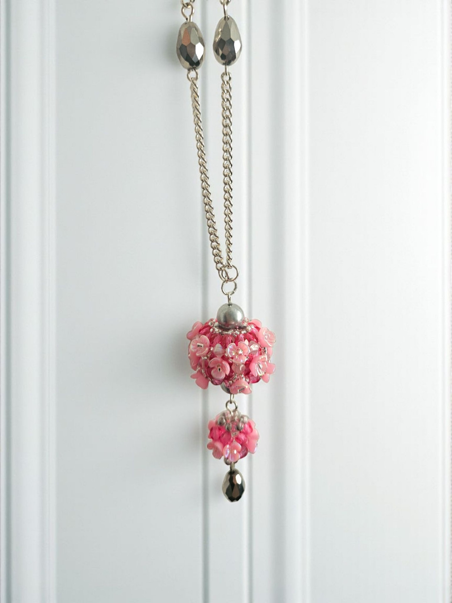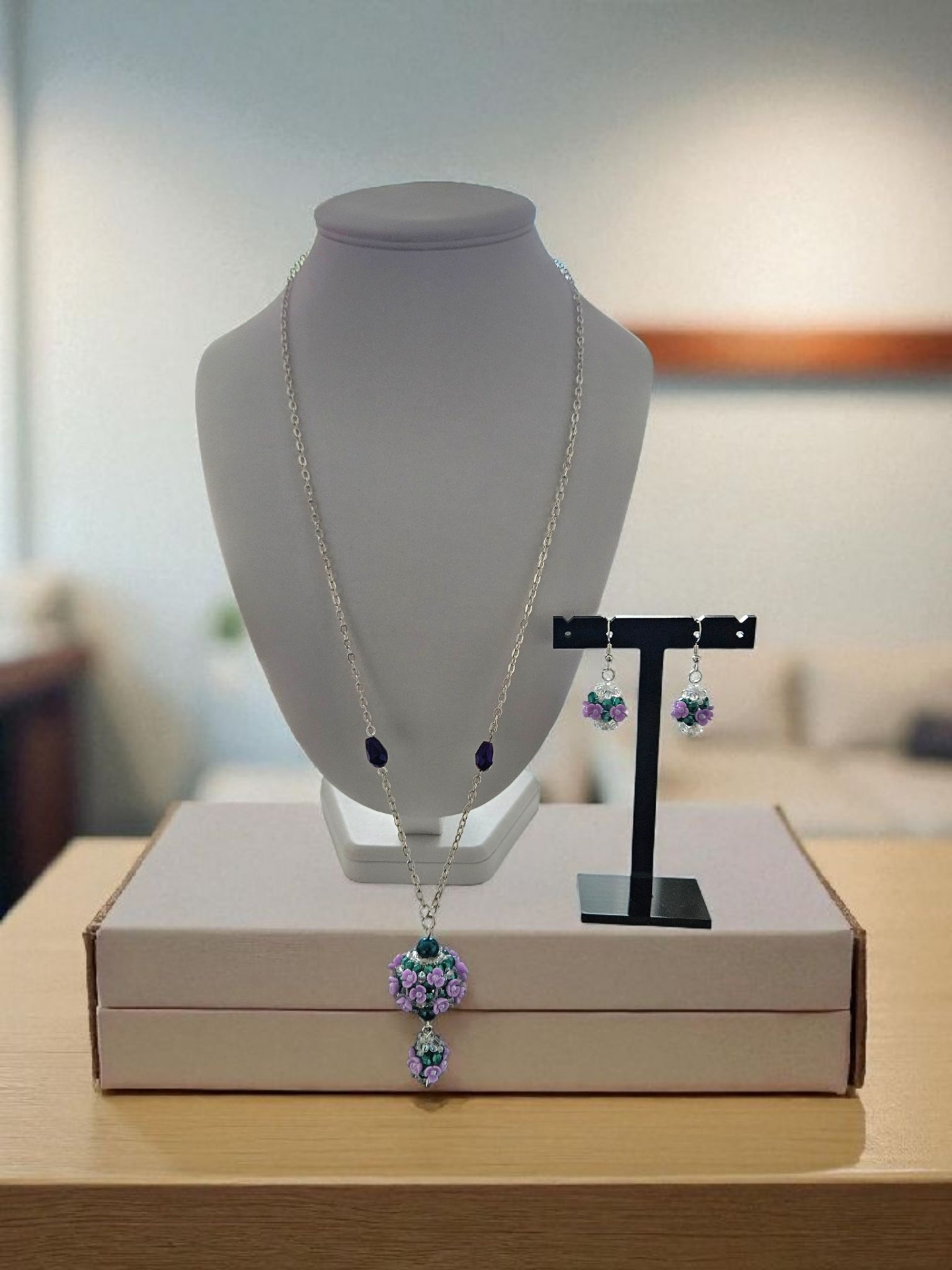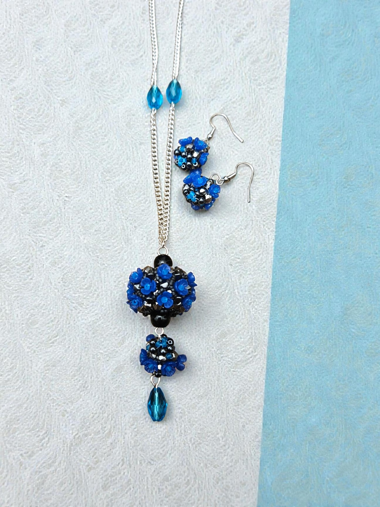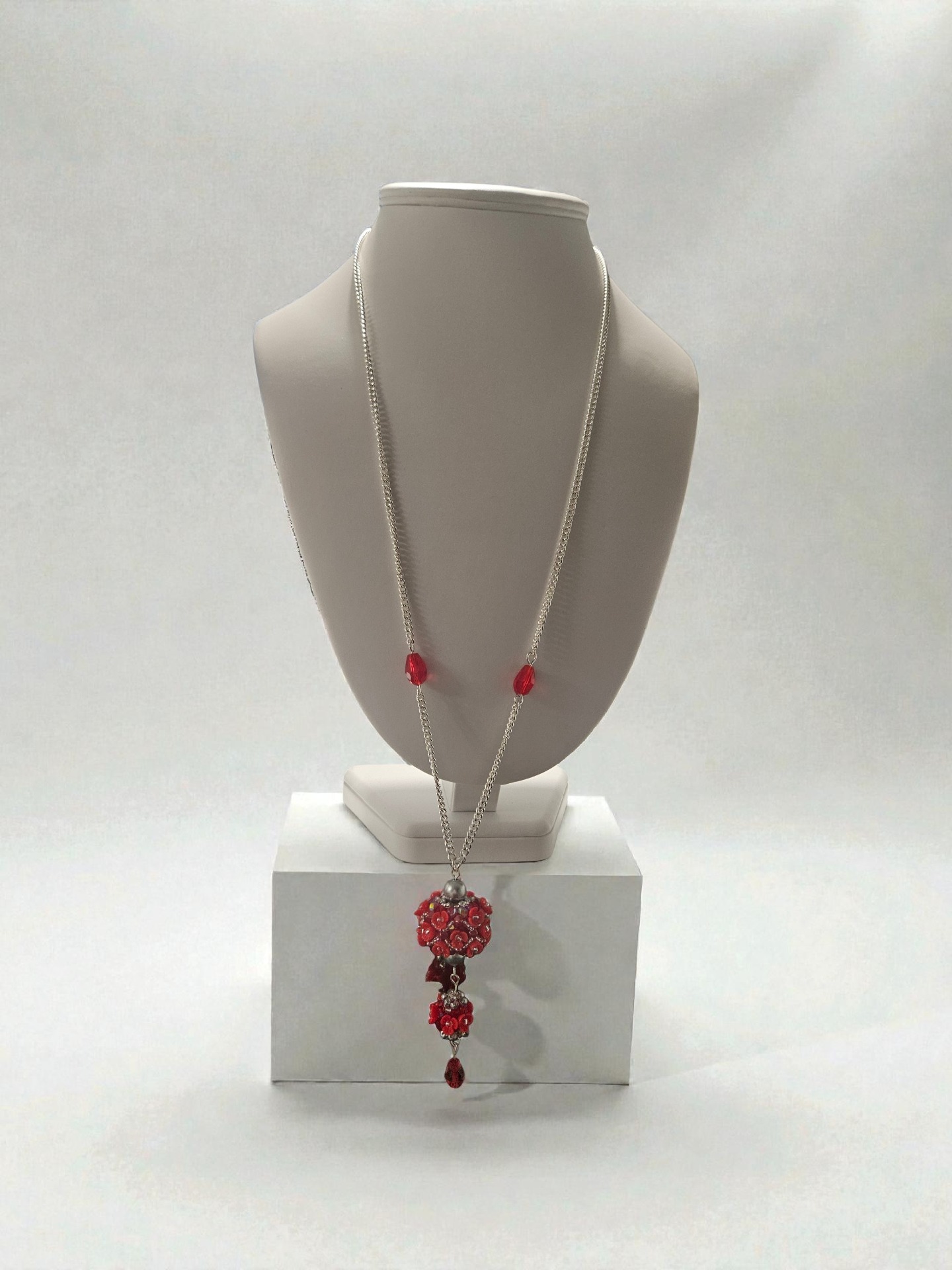 Elegantní sada květinového náhrdelníku a náušnic, vyrobeno z japonských korálků Toho, broušené kapky, ohňovek, bižuterní řetízek a zapínání, délka řetízku cca 2x 34cm plus závěs cca 7cm, délka náušnic včetně zapínání cca 7,5cm. Šperk je ideální pro slavnostní příležitosti, ale i jako originální doplněk k jednoduchému outfitu.