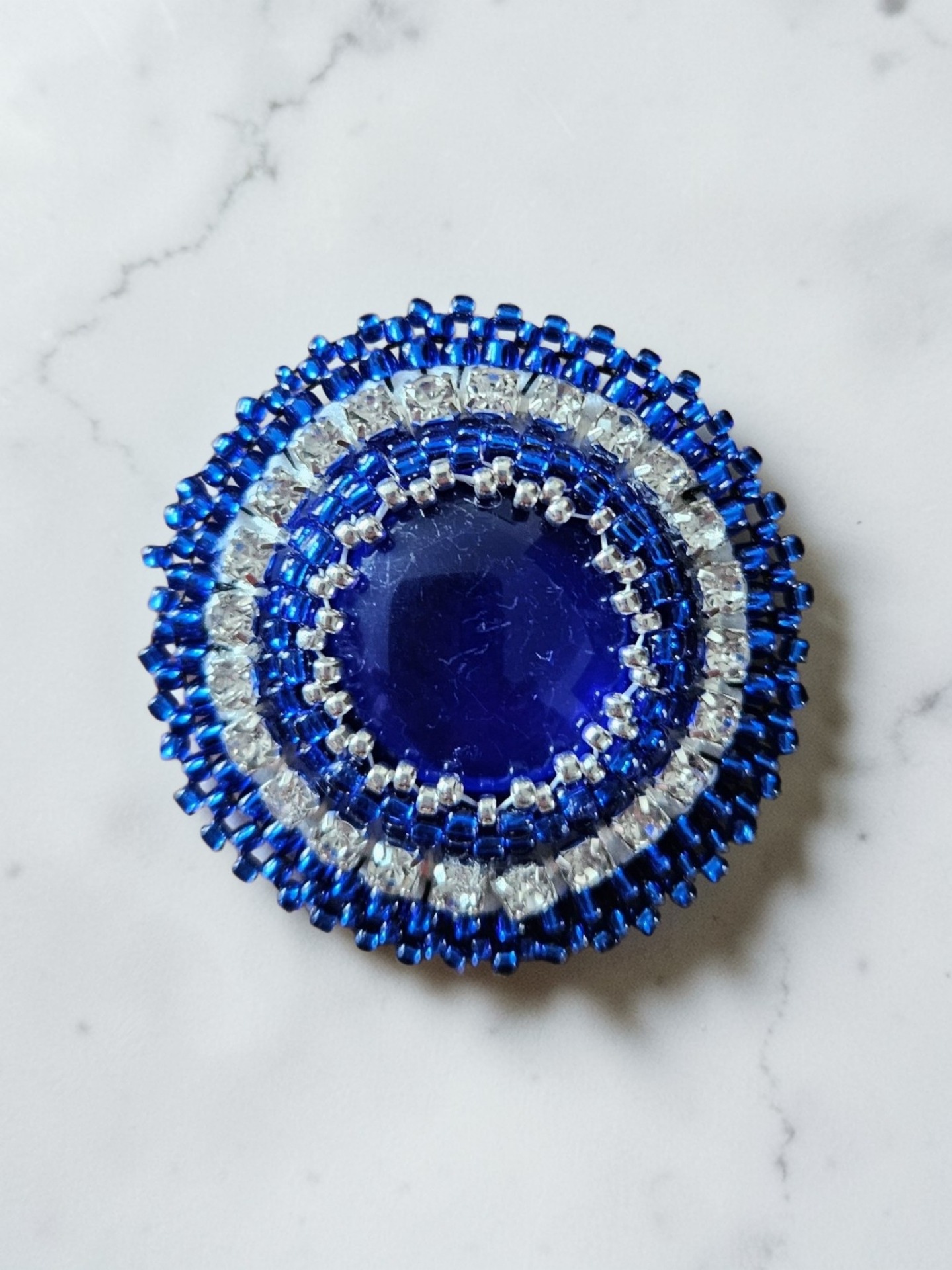 Dominantou brože je skleněný kabošon, které vytvářejí jedinečný vzor připomínající ledové krystaly nebo jemnou kresbu zimní krajiny. Kabošon je pečlivě obšitý japonskými skleněnými korálky Toho, které jsou známé svou vysokou kvalitou a pravidelným tvarem.