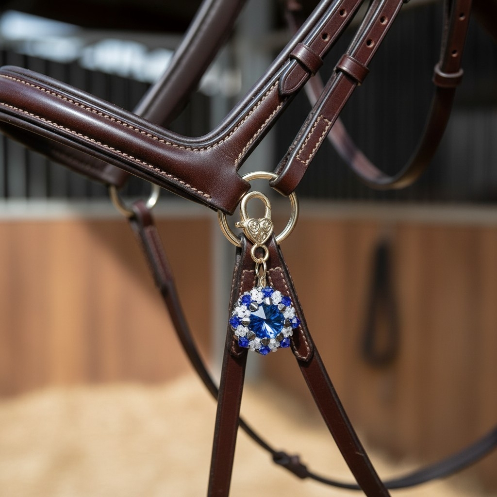 Dominantou ozdoby na uzdečku je skleněný šaton obšitý japonskými korálky Toho a broušenými skleněnými korálky.