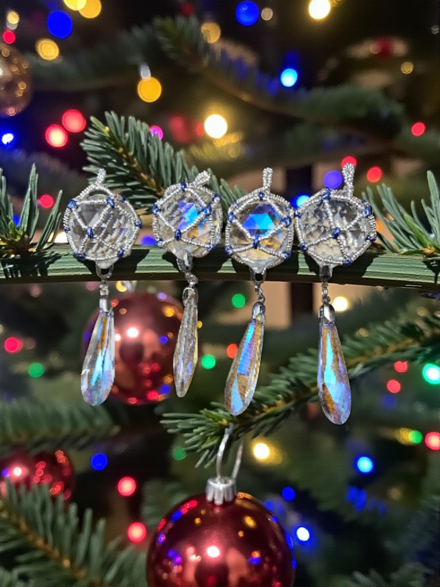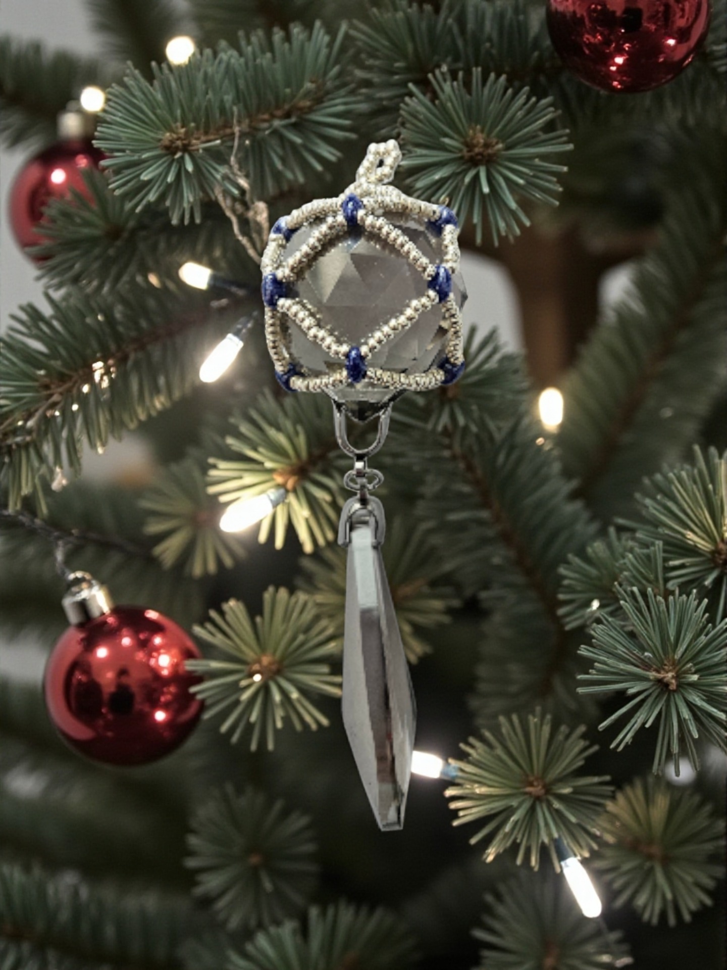 krásně se třpytící vánoční ozdoba, skleněné broušené lustrové ověsy v barvě světlounce šedé až do stříbrna, korálky miyuki a superduo, celková délka cca 11cm, hmotnost 48g